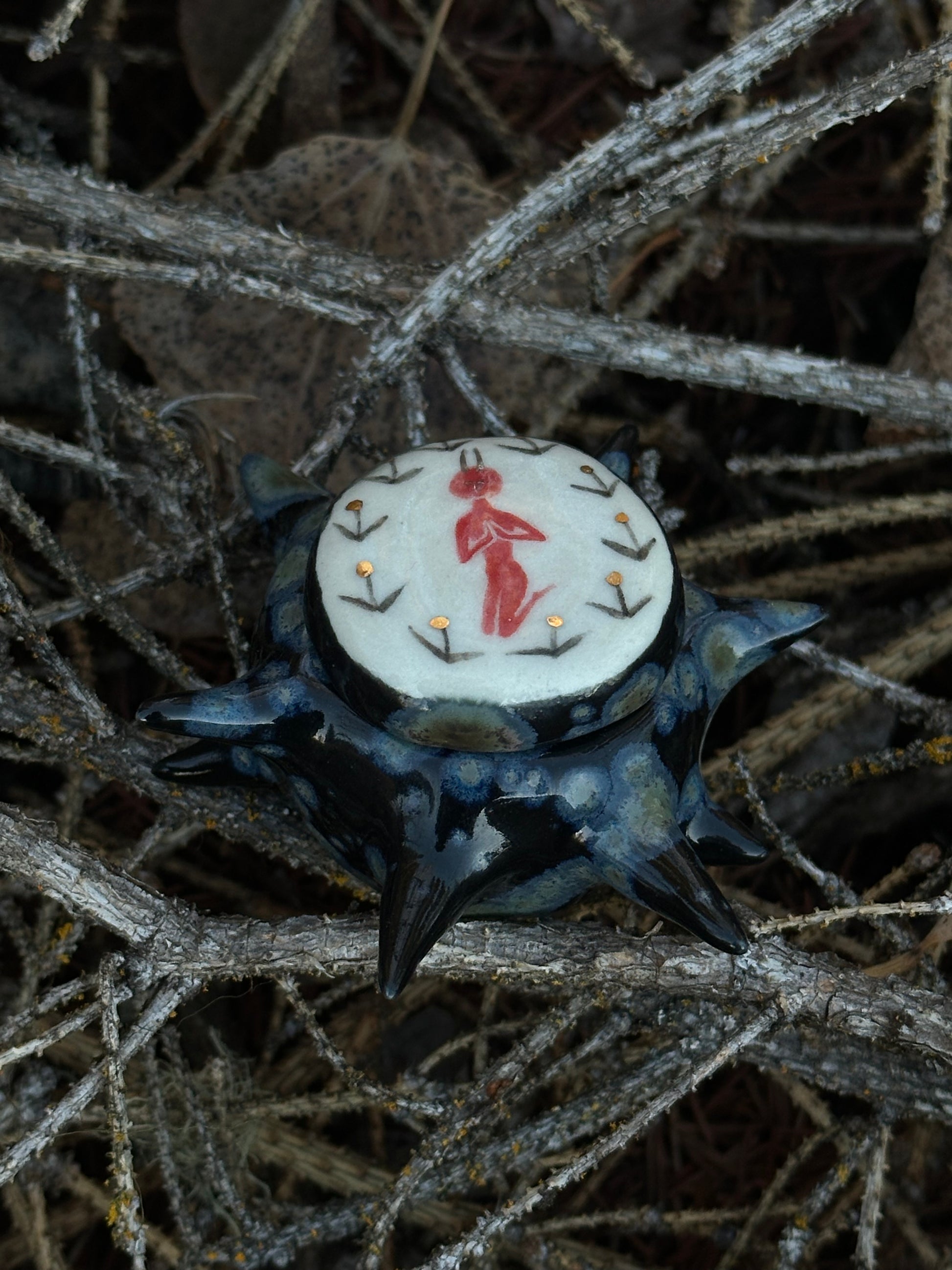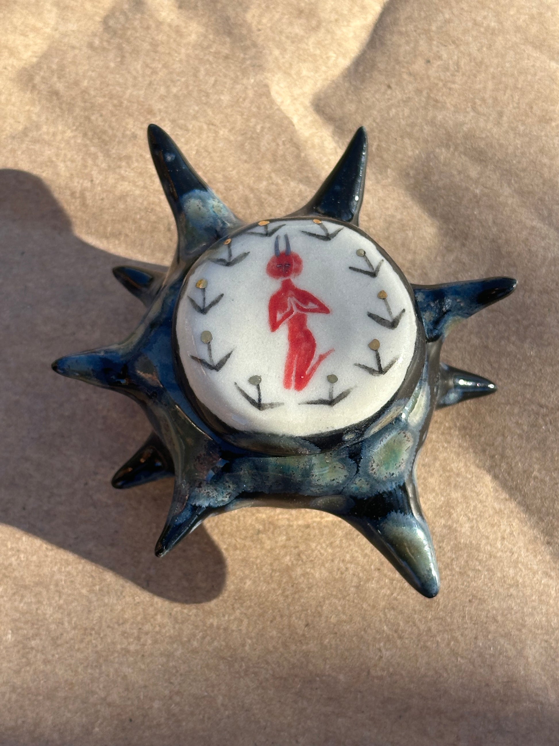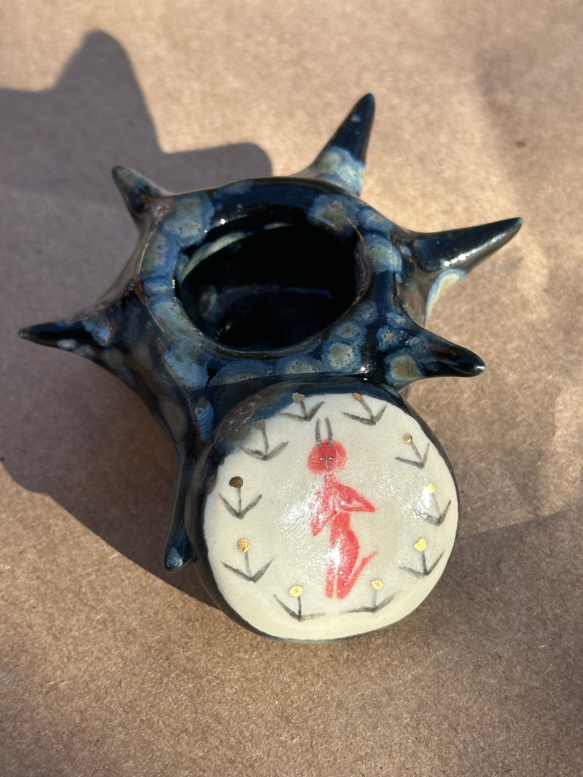 Rich illustrations with a glass like clear glaze on top, detailed with 24k gold and white gold lustre. Adorned with a blooming algae glaze and seed like shape.