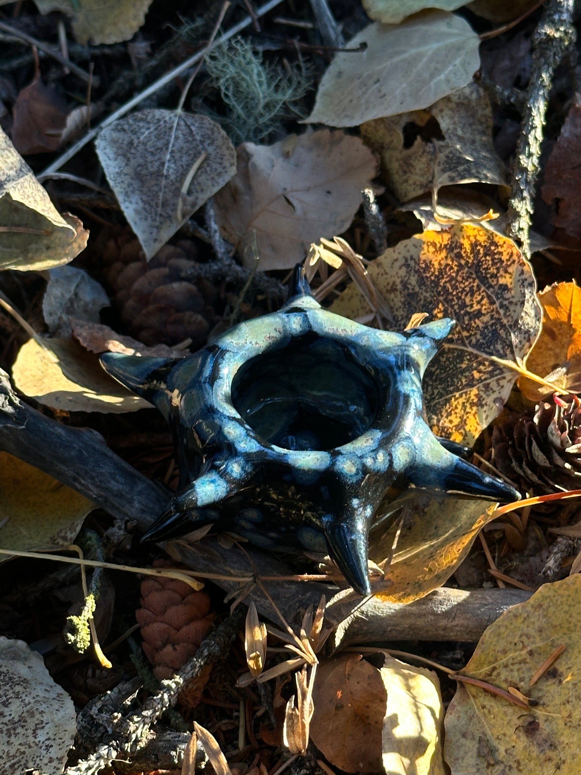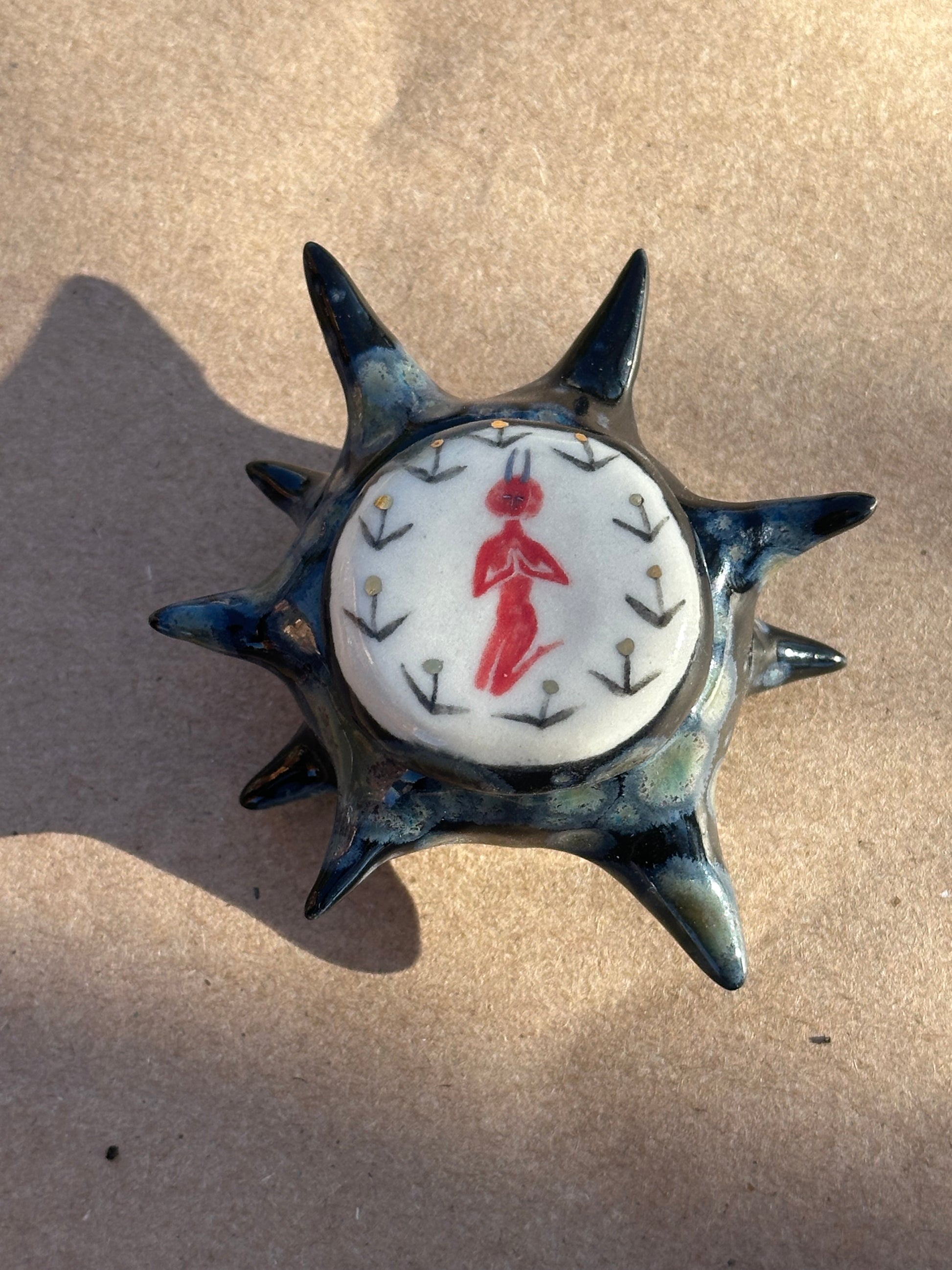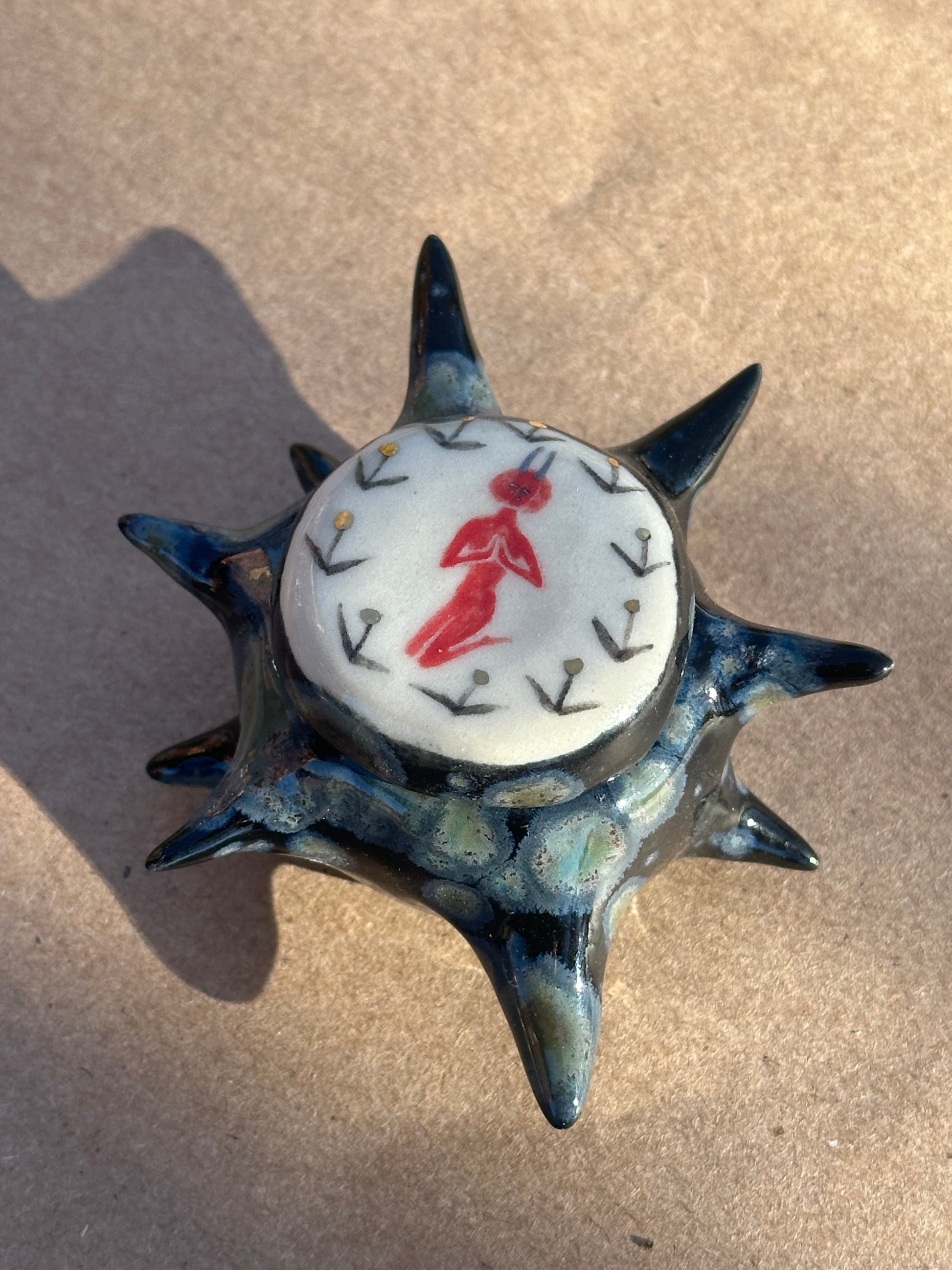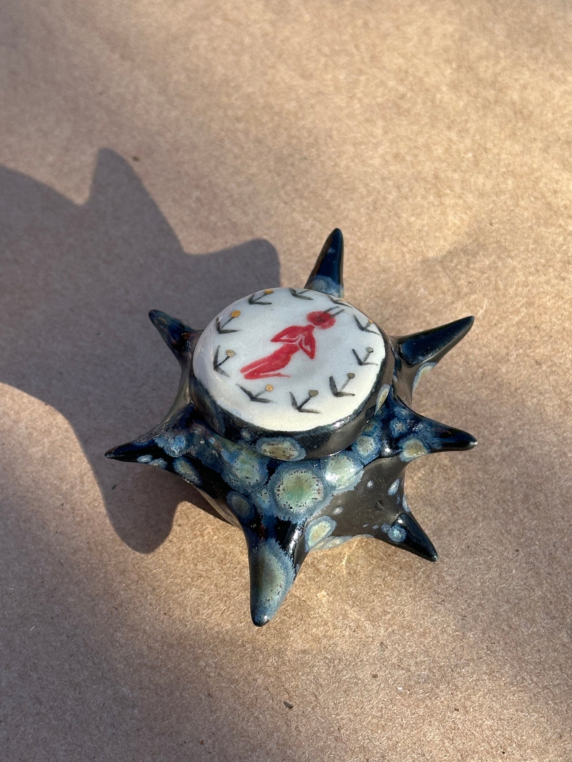 Rich illustrations with a glass like clear glaze on top, detailed with 24k gold and white gold lustre. Adorned with a blooming algae glaze and seed like shape.