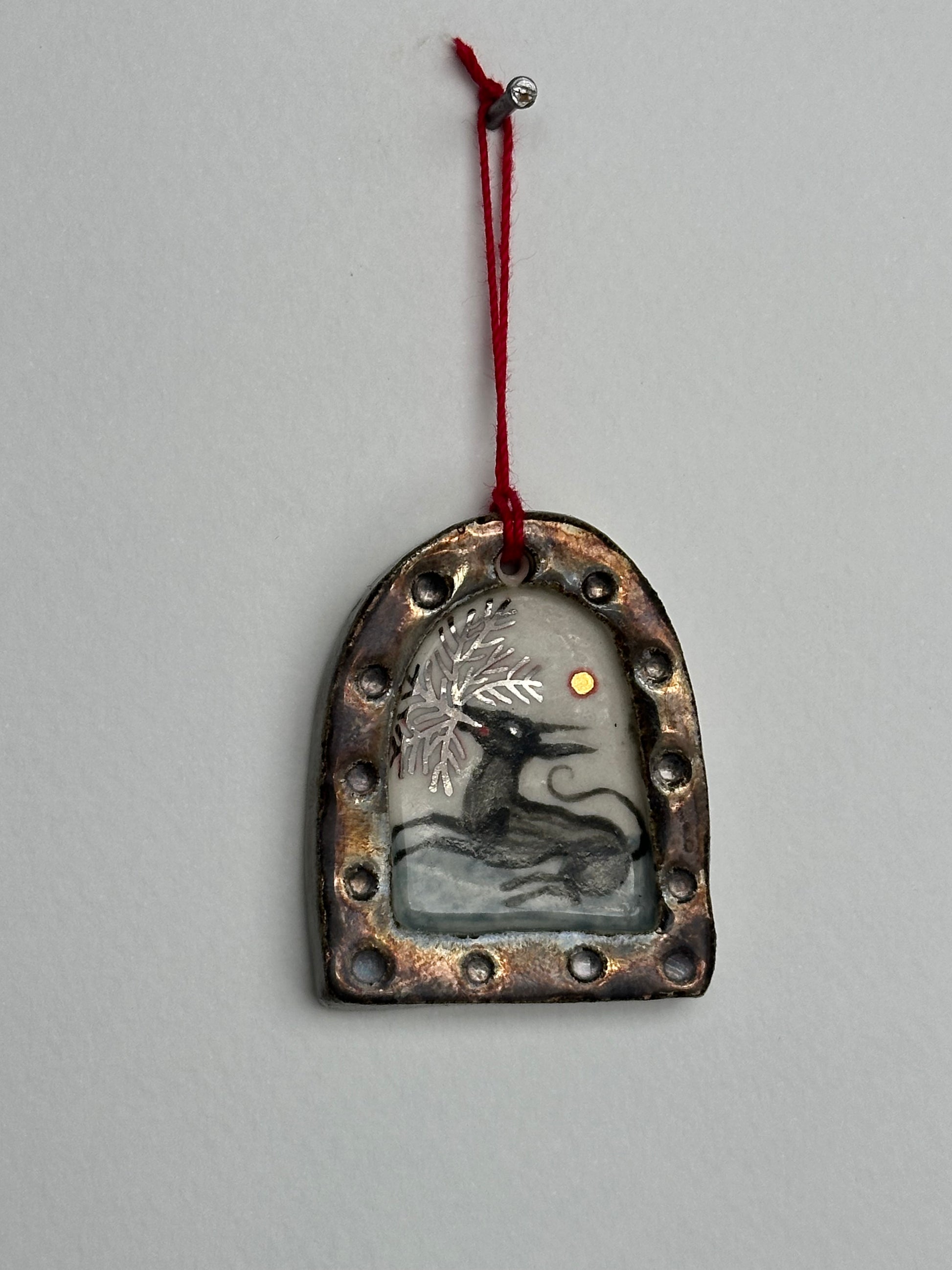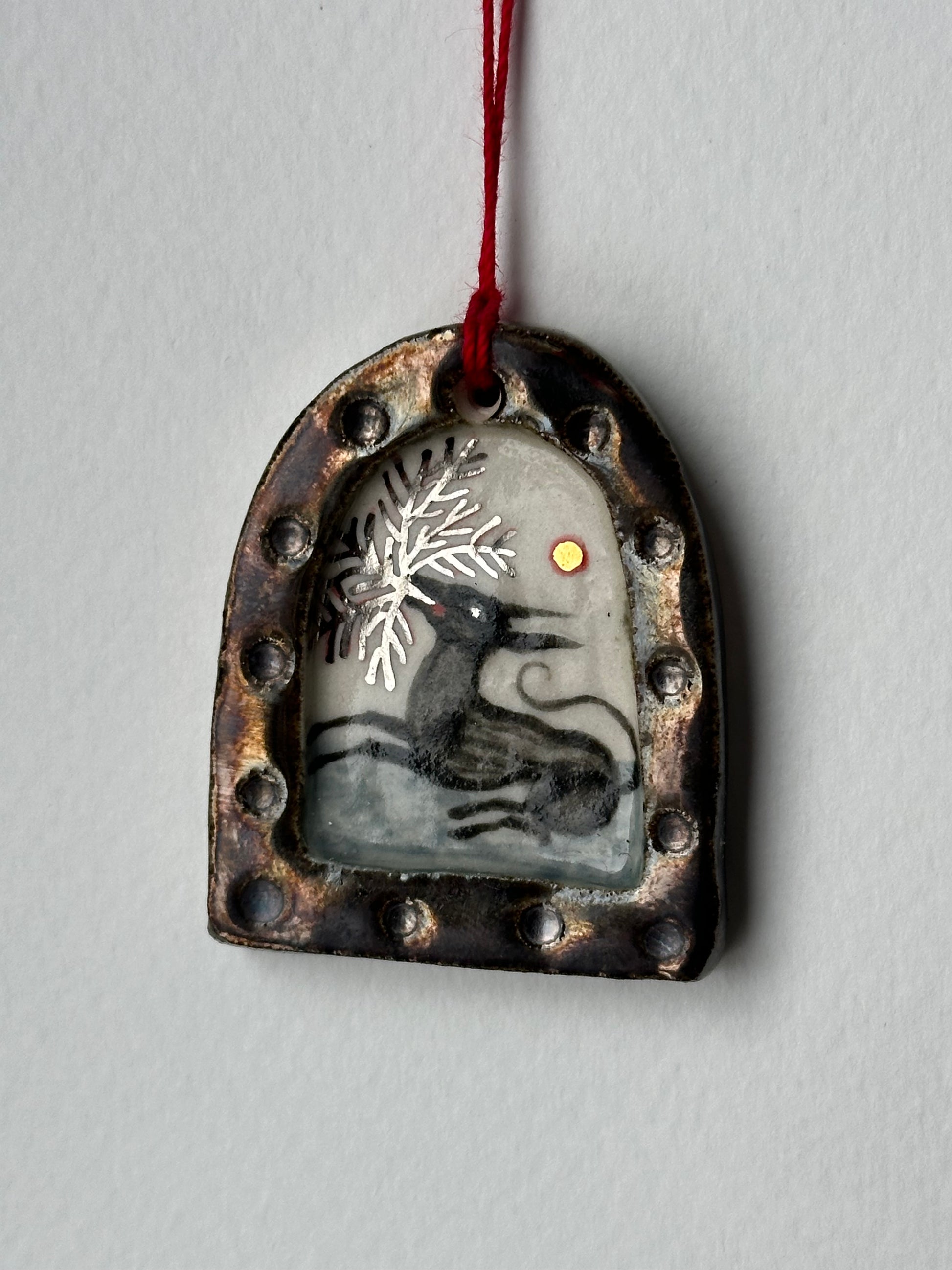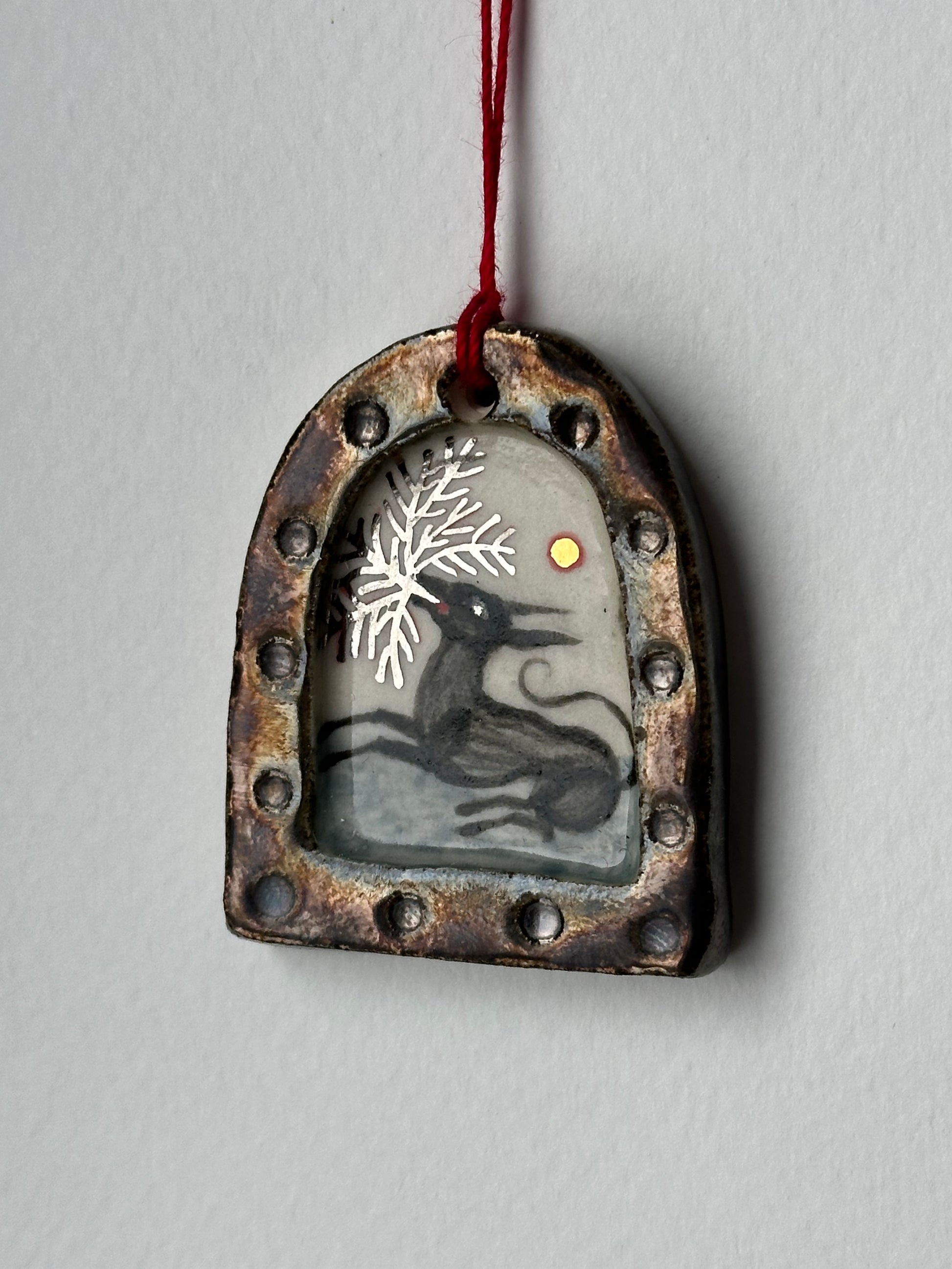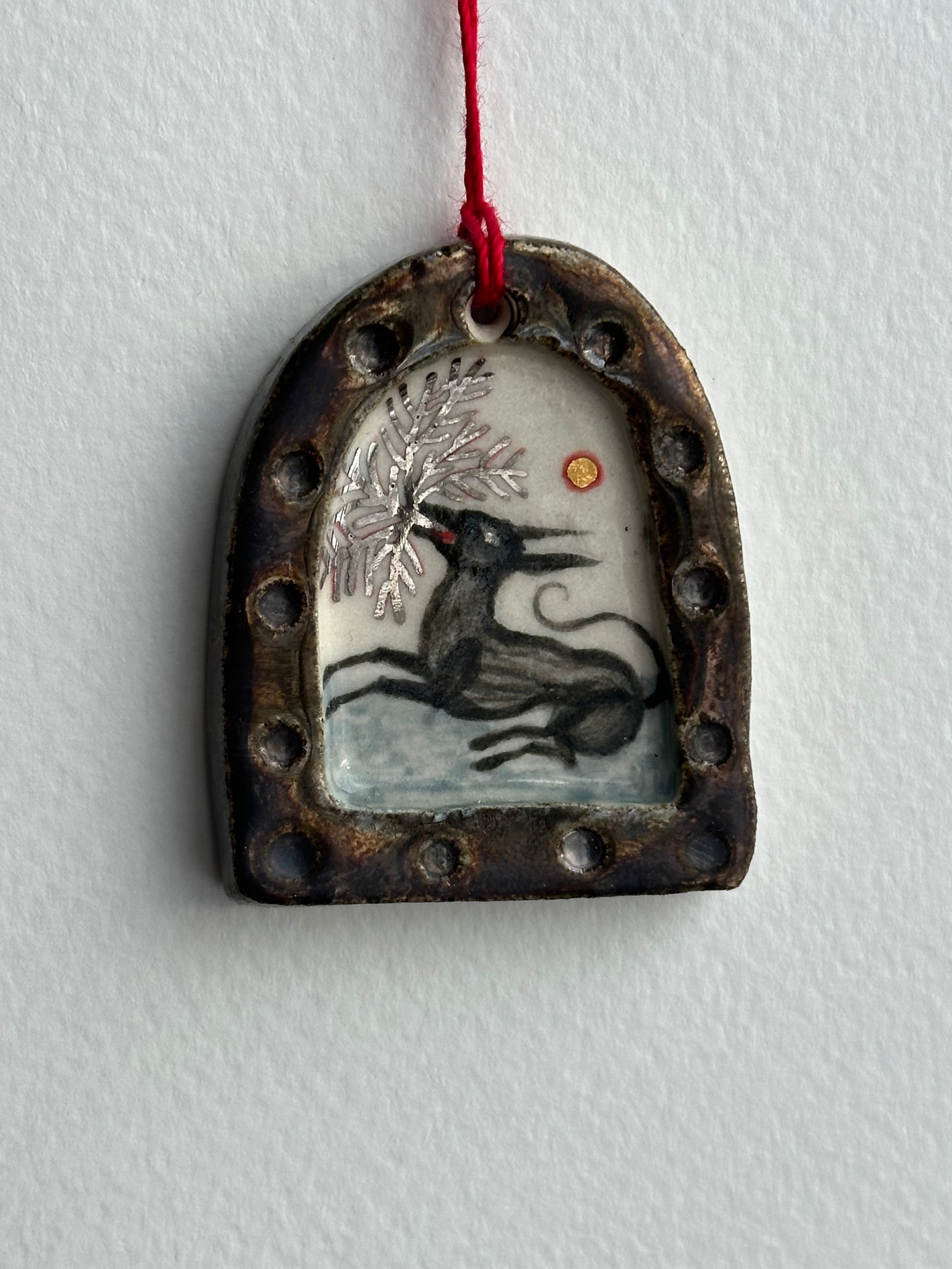 Original hand-sculpted porcelain painting, delicately formed and painted with rich underglaze tones, an earthy rusty glaze, and finished with shimmering touches of 24 karat gold and white gold lustre. Each miniature realm captures a glimpse into an imagined world, where fantastical creatures weave spells, stir mischief, and breathe life into unseen magick.