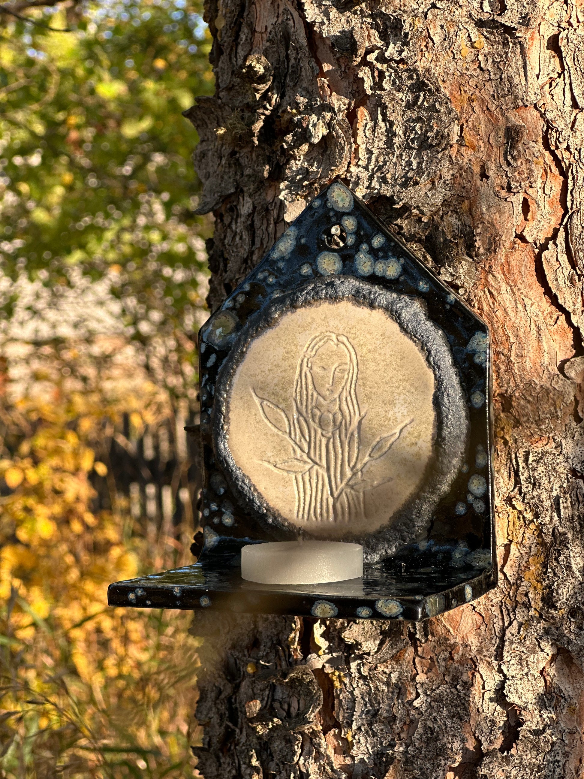 Rich illustration created with a carved relief technique. Painted with various earthy glazes, set to honour autumnal shades and textures. Made to last for centuries to come.