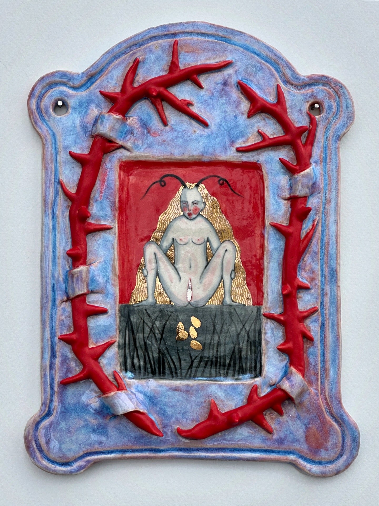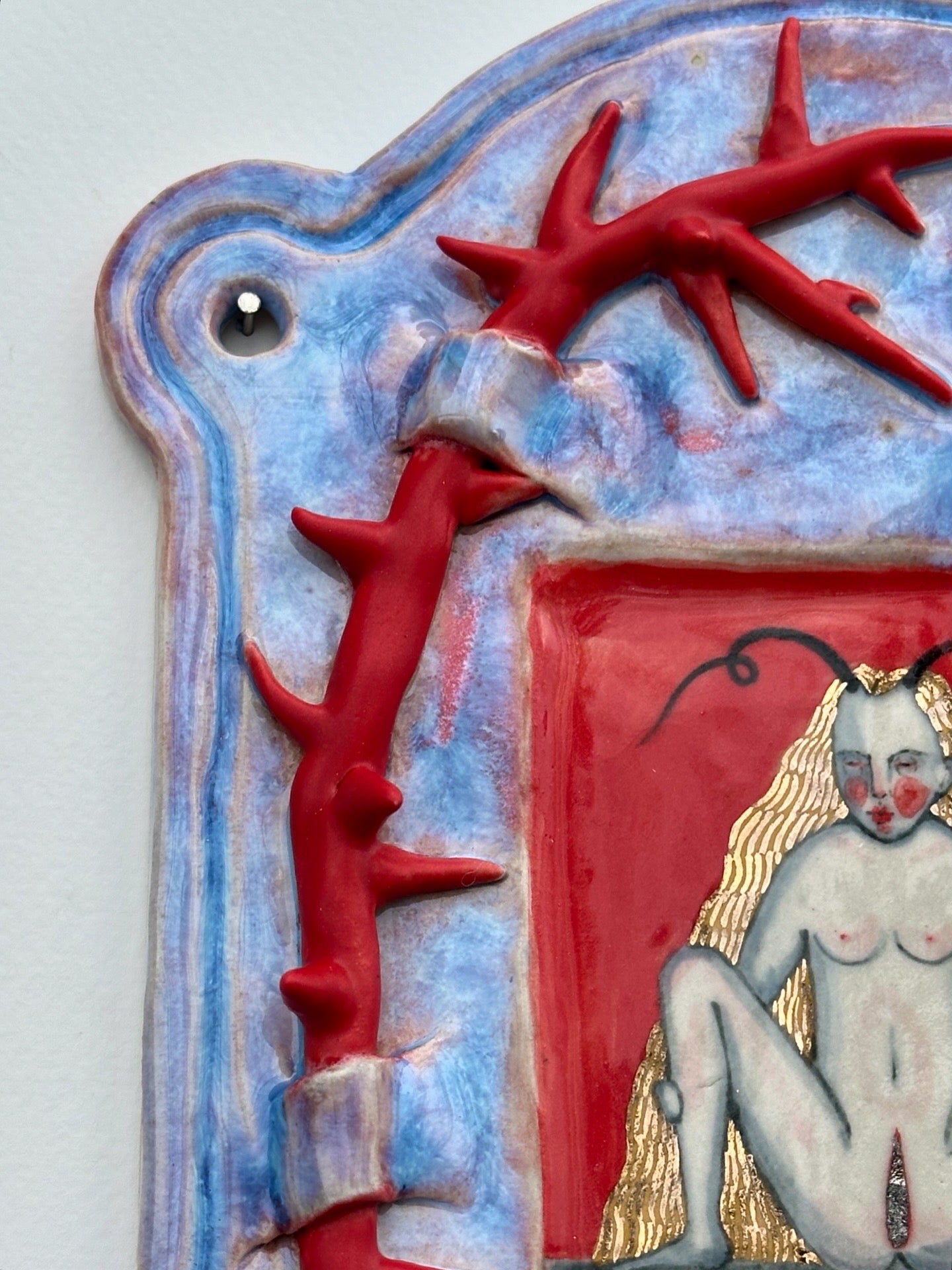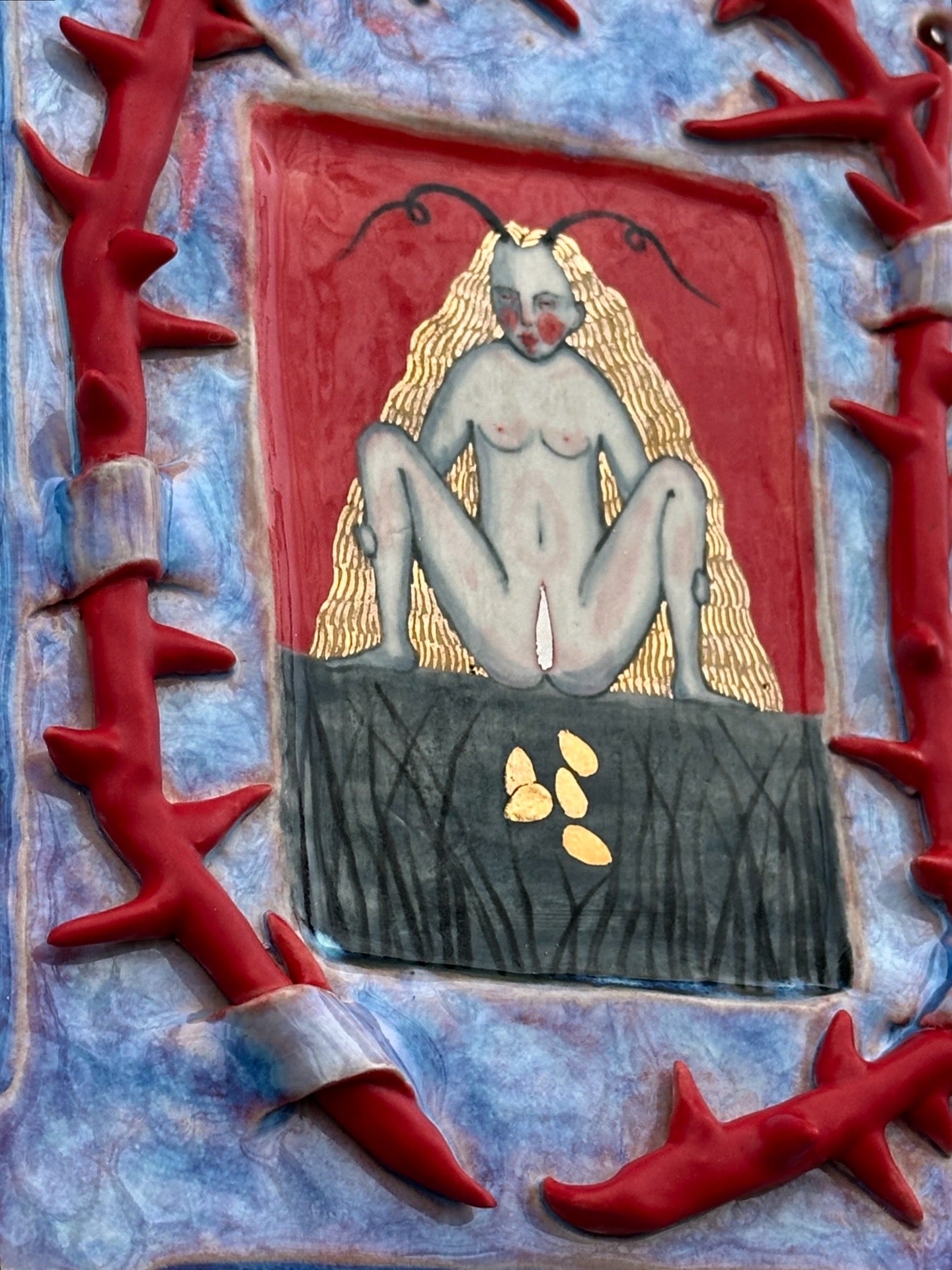 Porcelain Painting created with various underglazes and glazes, detailed with 24-karat gold and white gold lustre.
