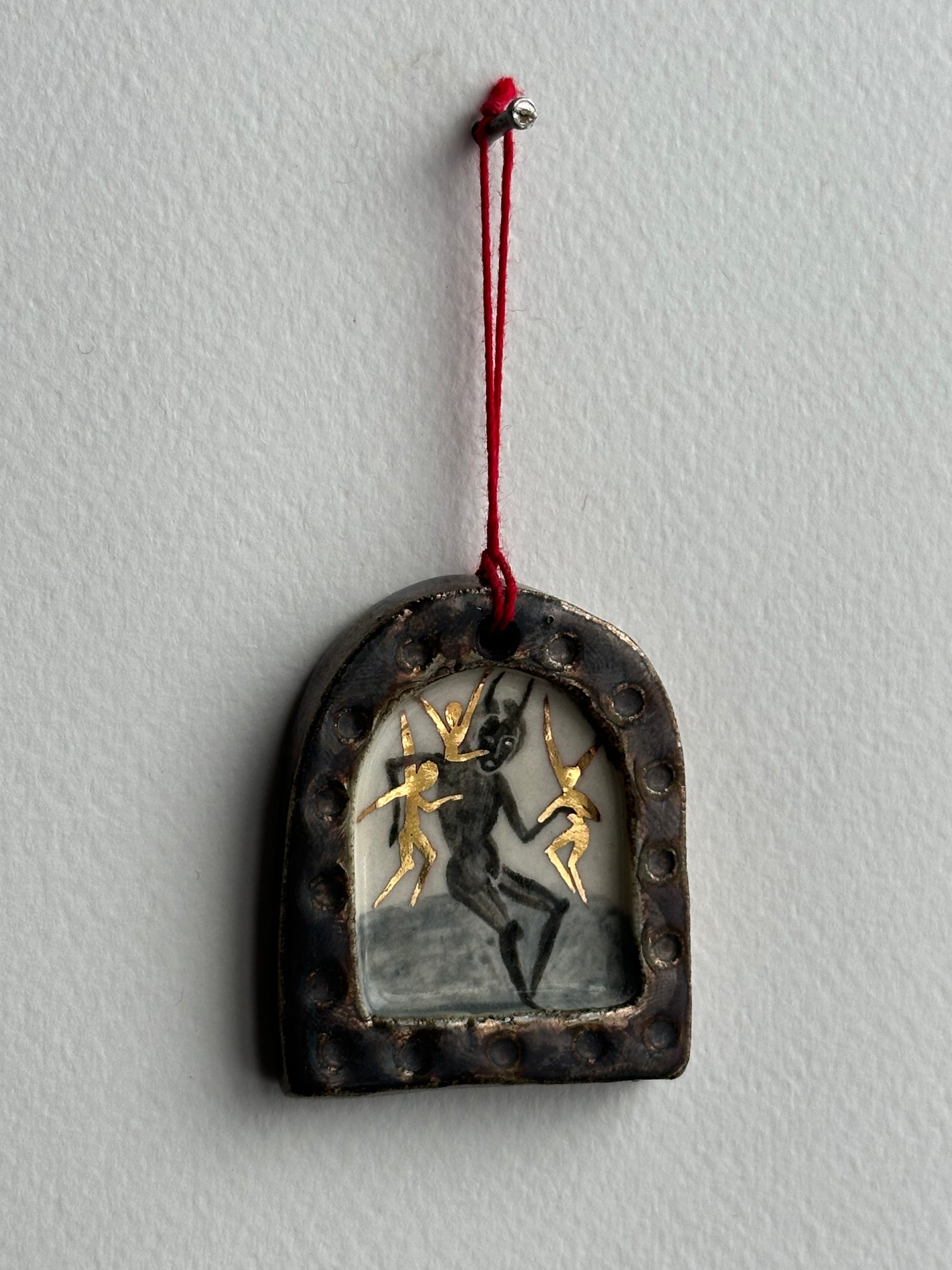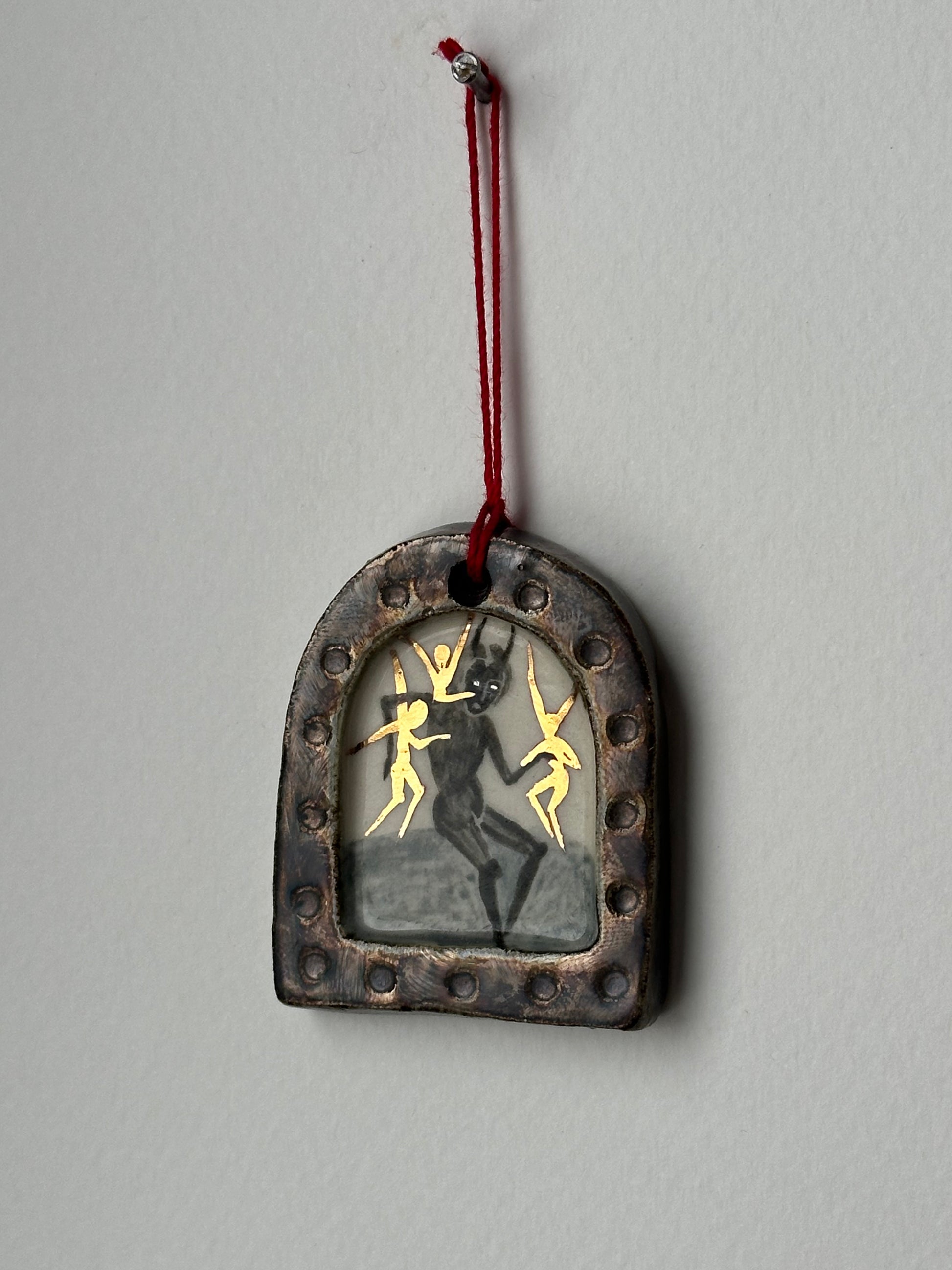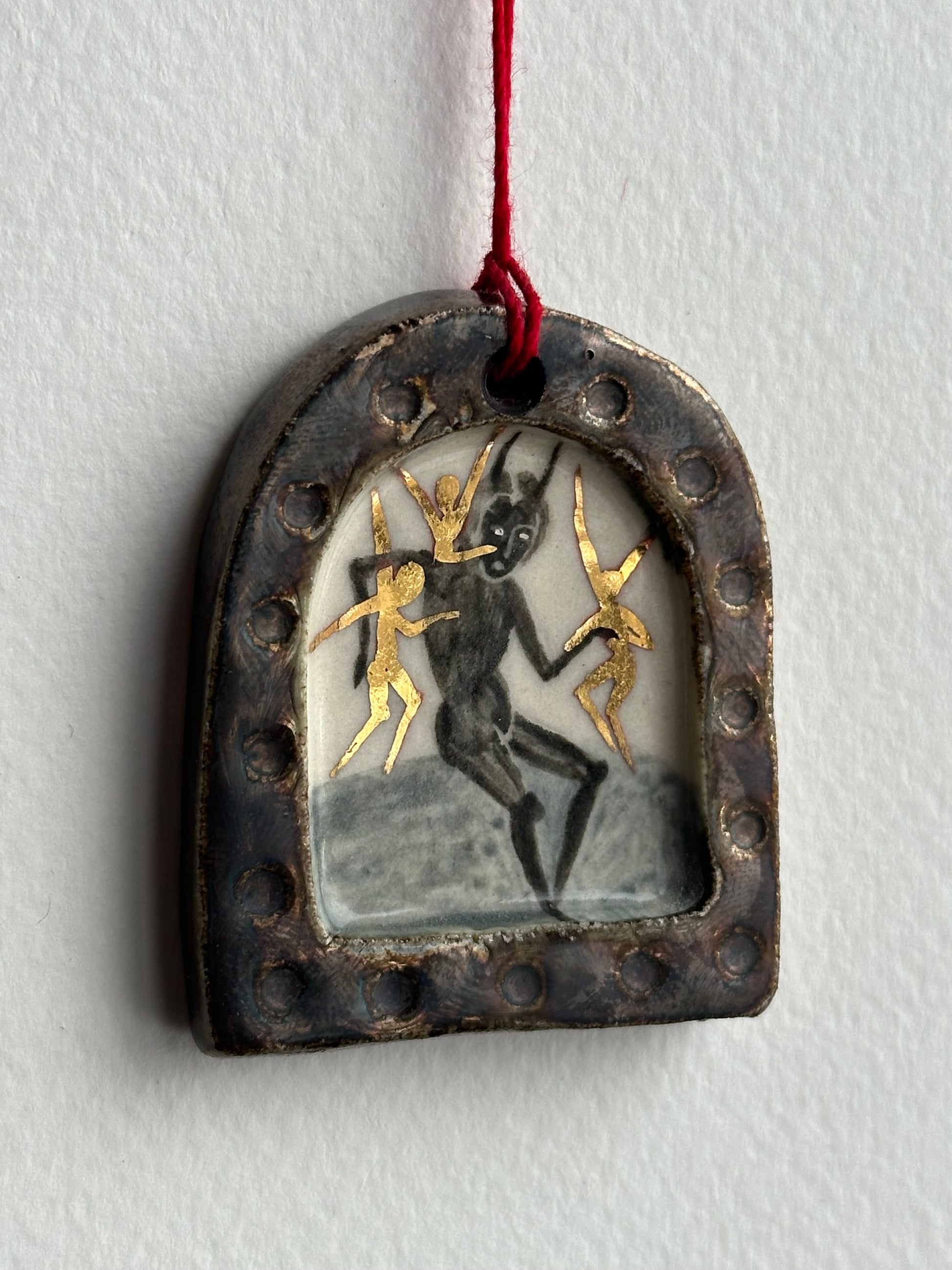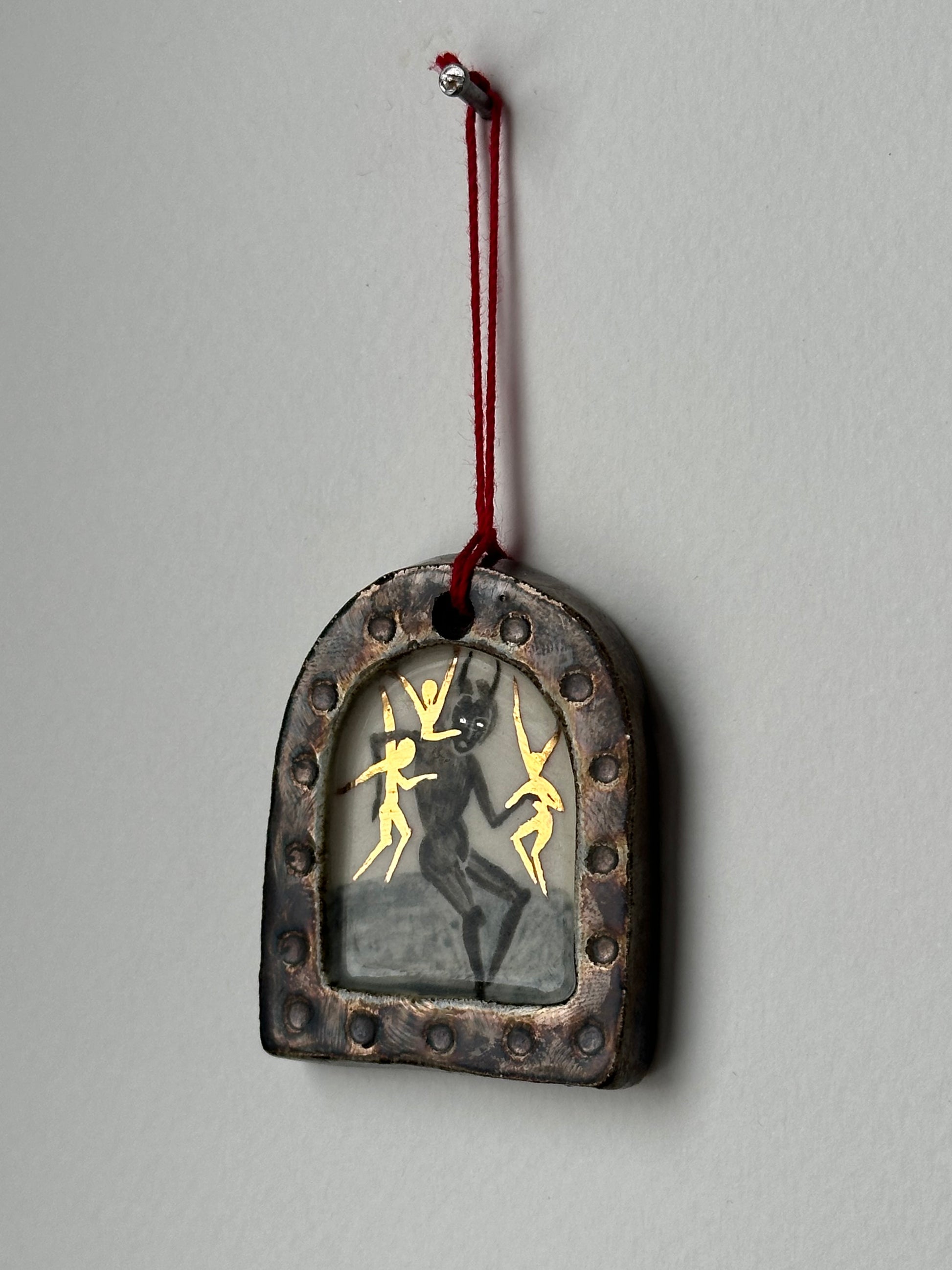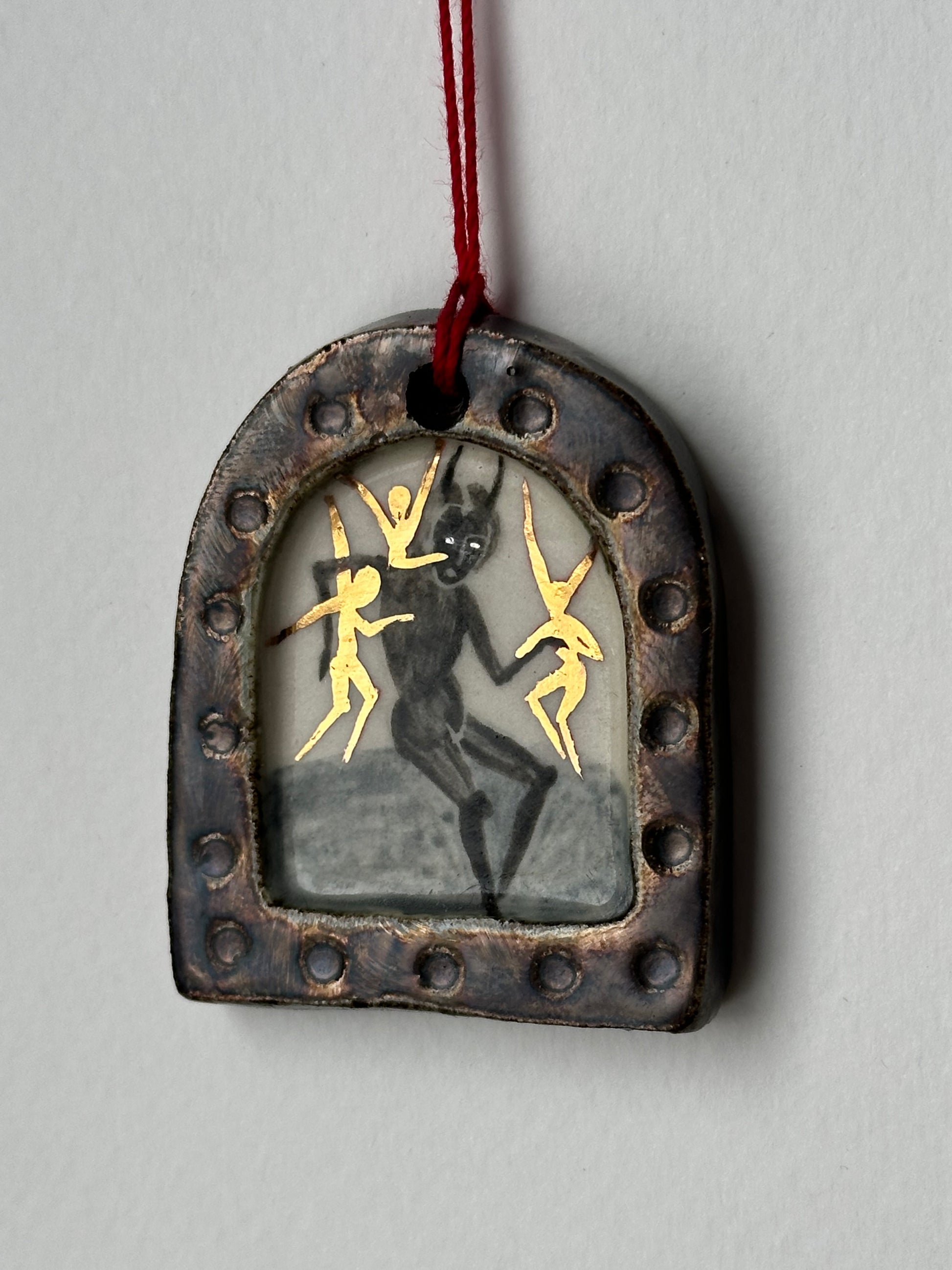 Original hand-sculpted porcelain painting, delicately formed and painted with rich underglaze tones, an earthy rusty glaze, and finished with shimmering touches of 24 karat gold and white gold lustre. Each miniature realm captures a glimpse into an imagined world, where fantastical creatures weave spells, stir mischief, and breathe life into unseen magick.