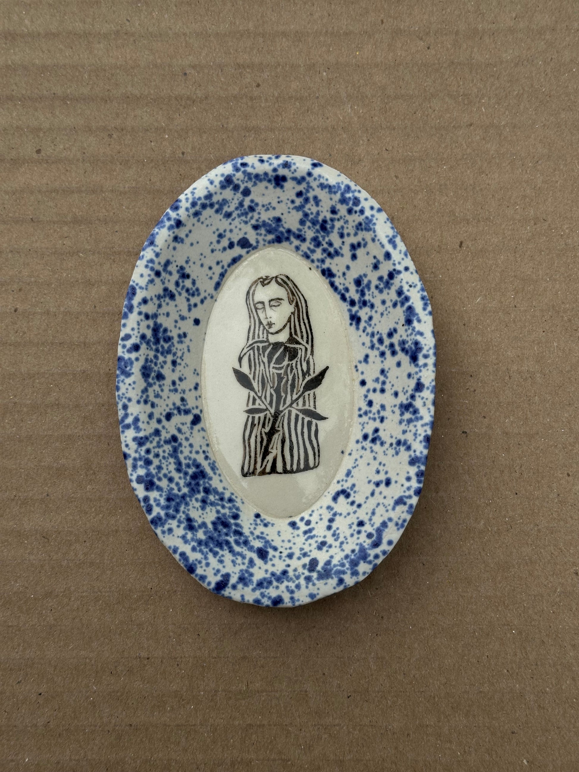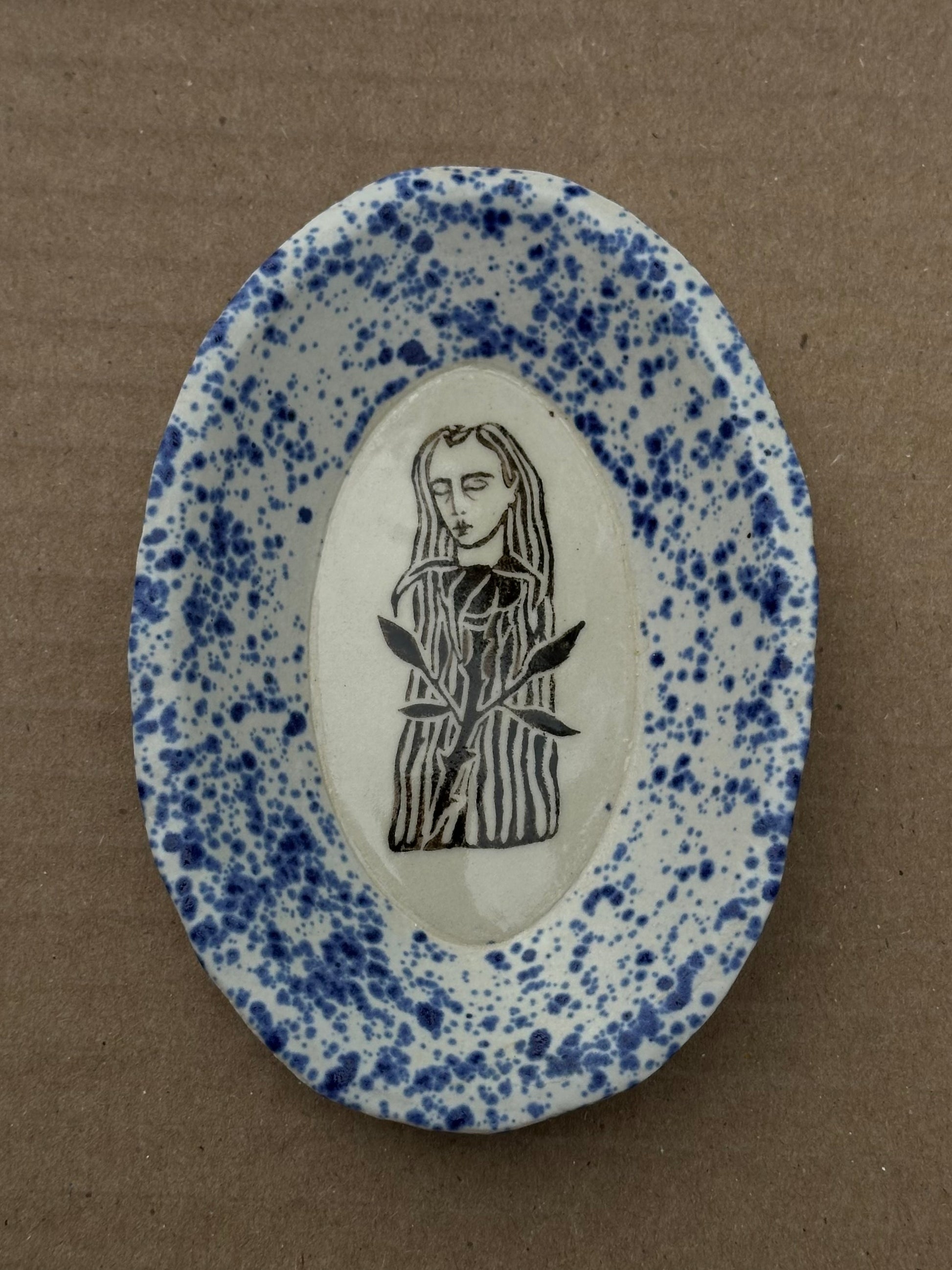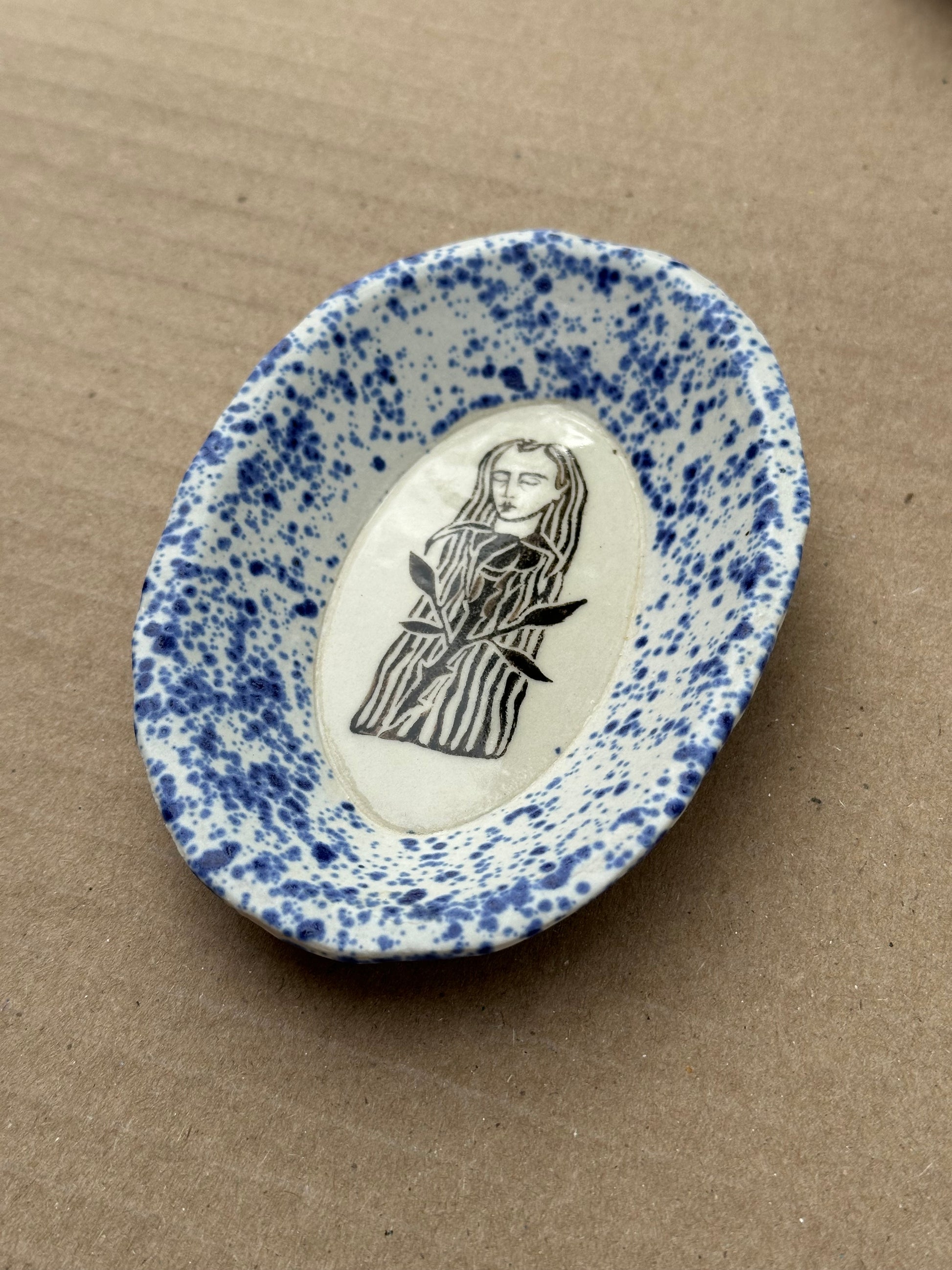Exterior of the dish is glazed with milky satin featuring small blue blooms that cause the glaze to resemble the look of 19th century enamelware.