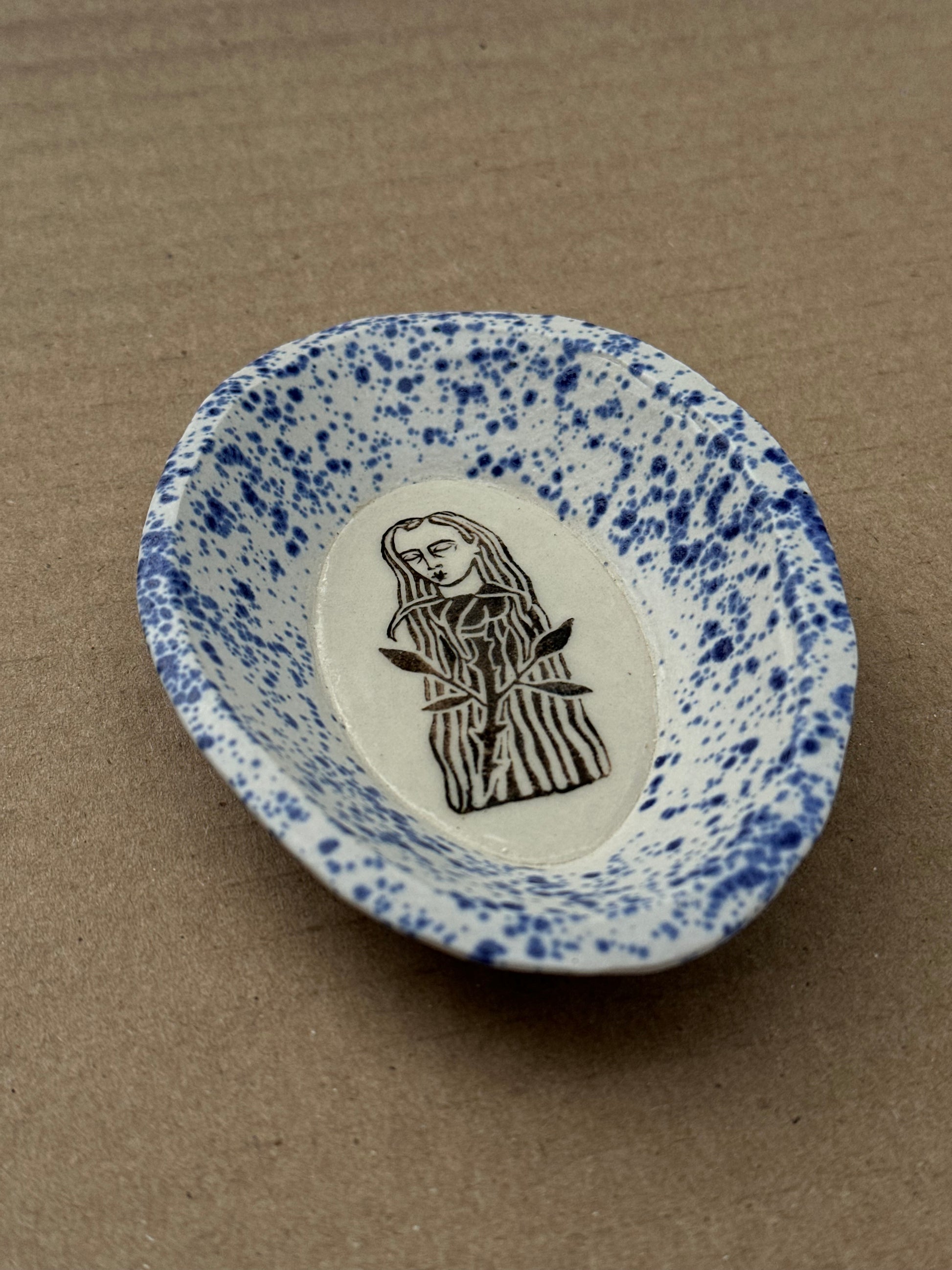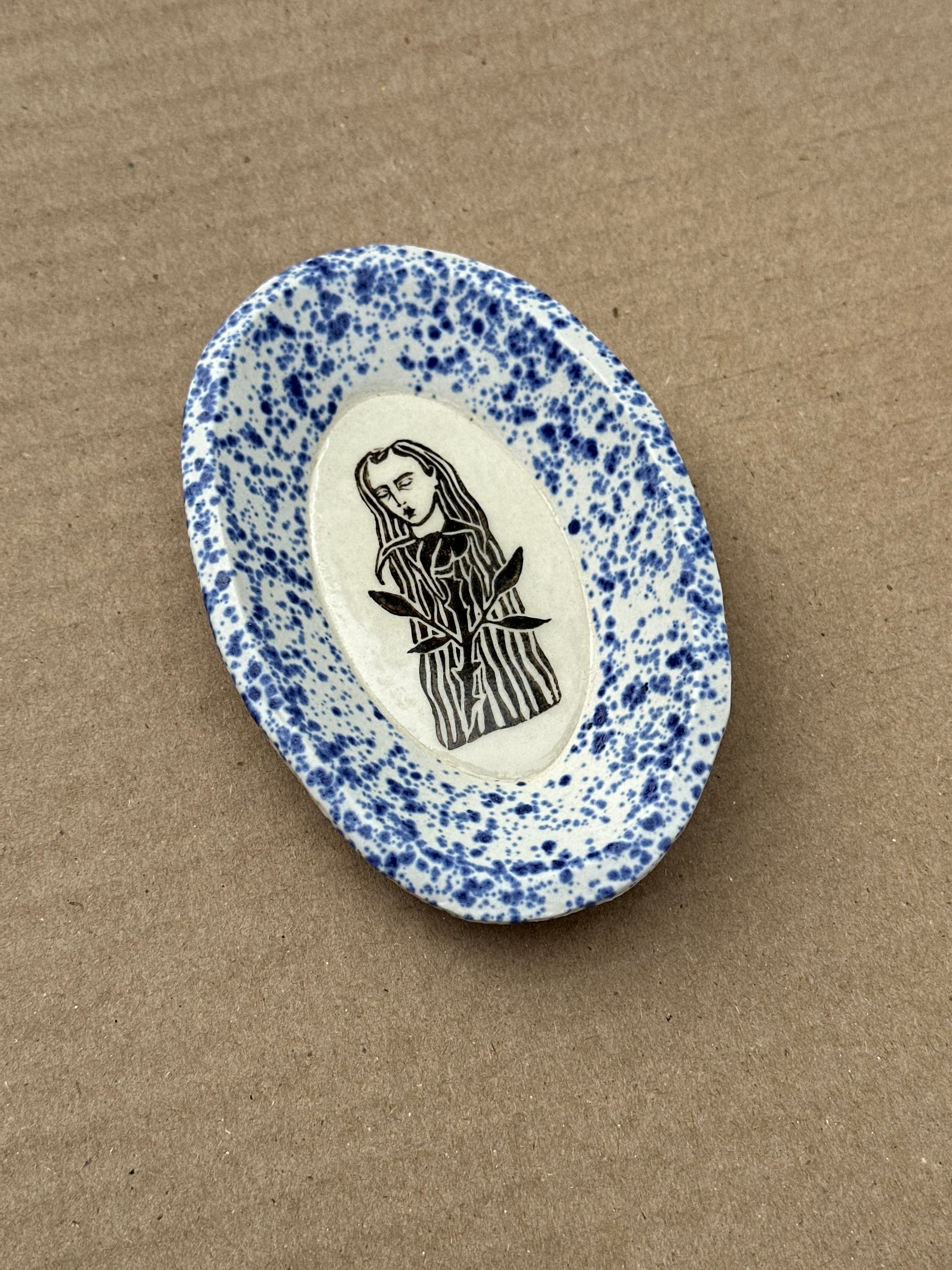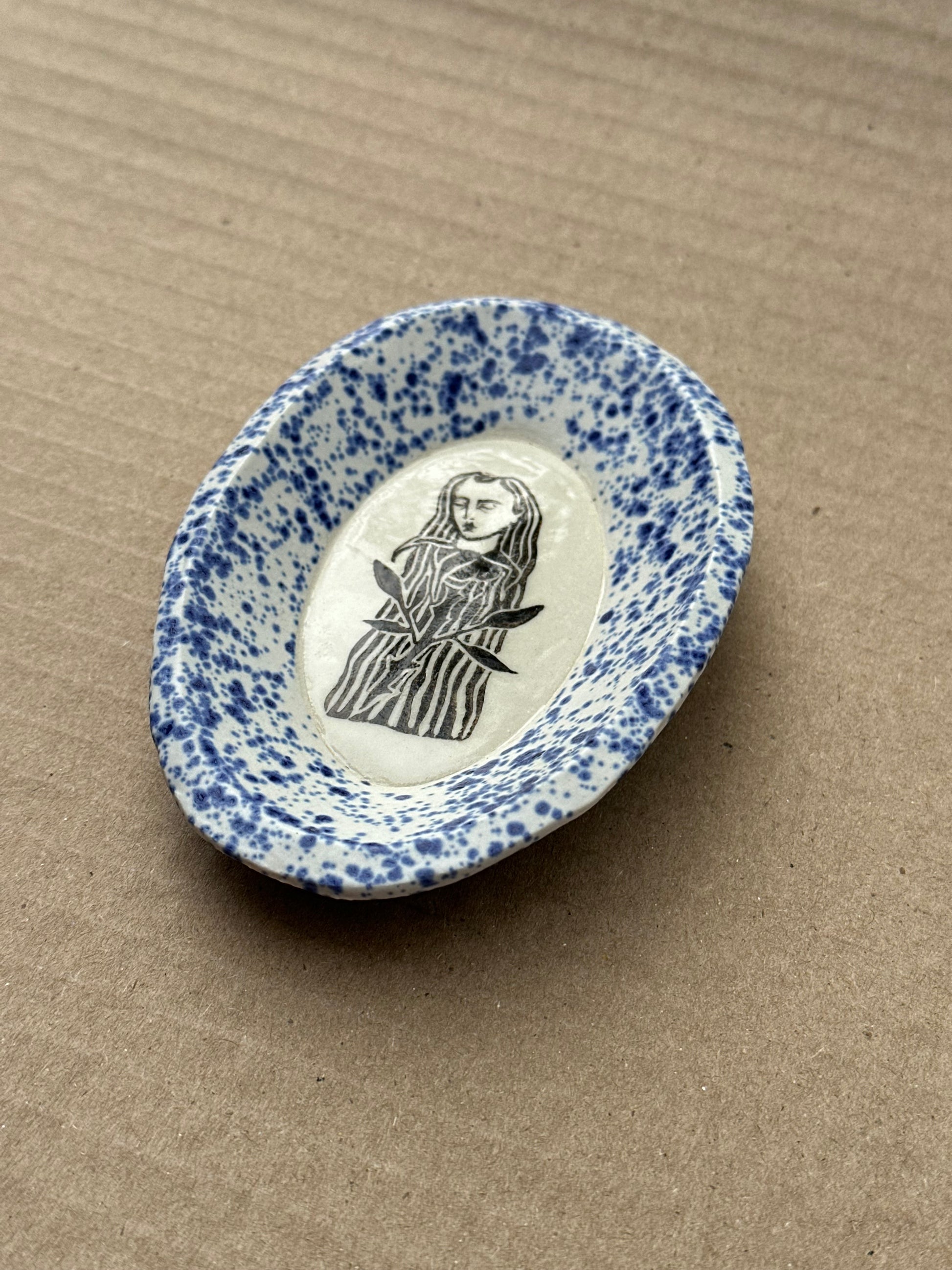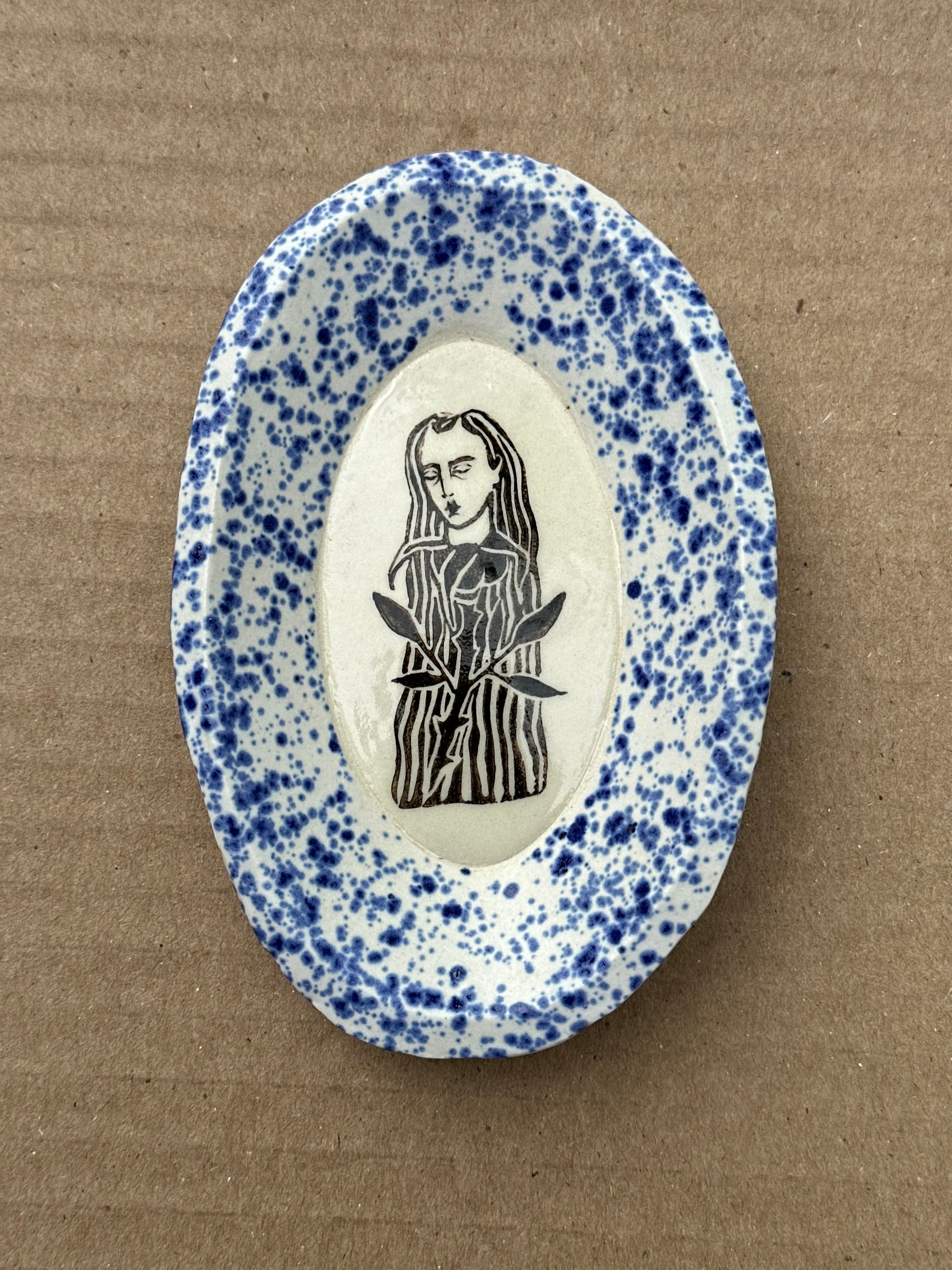 Exterior of the dish is glazed with milky satin featuring small blue blooms that cause the glaze to resemble the look of 19th century enamelware.