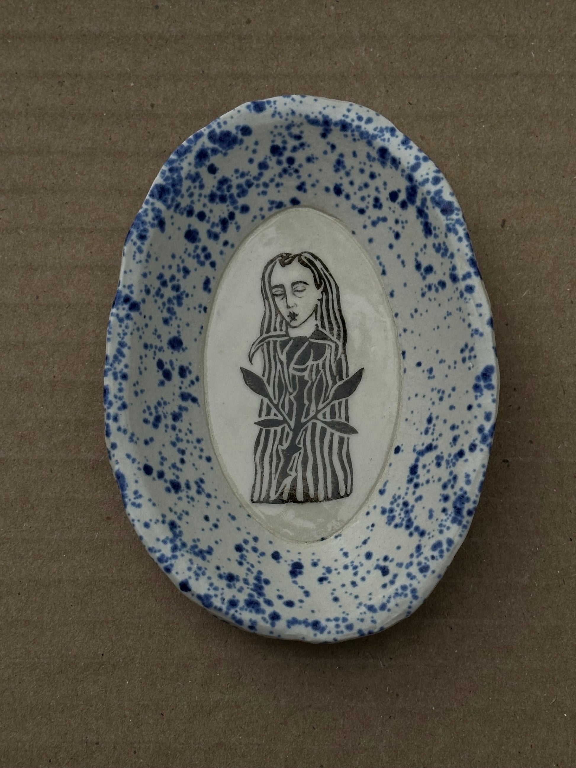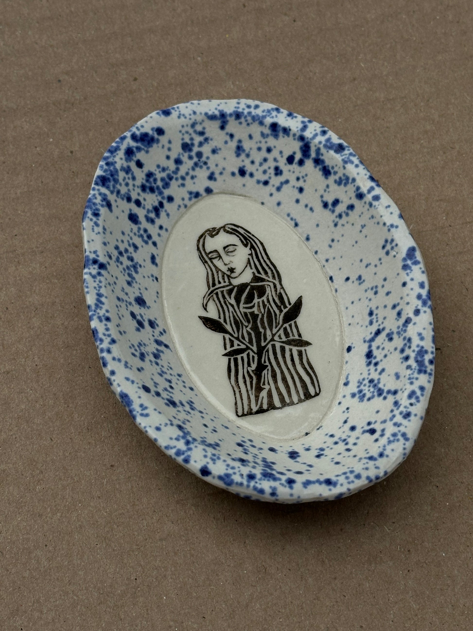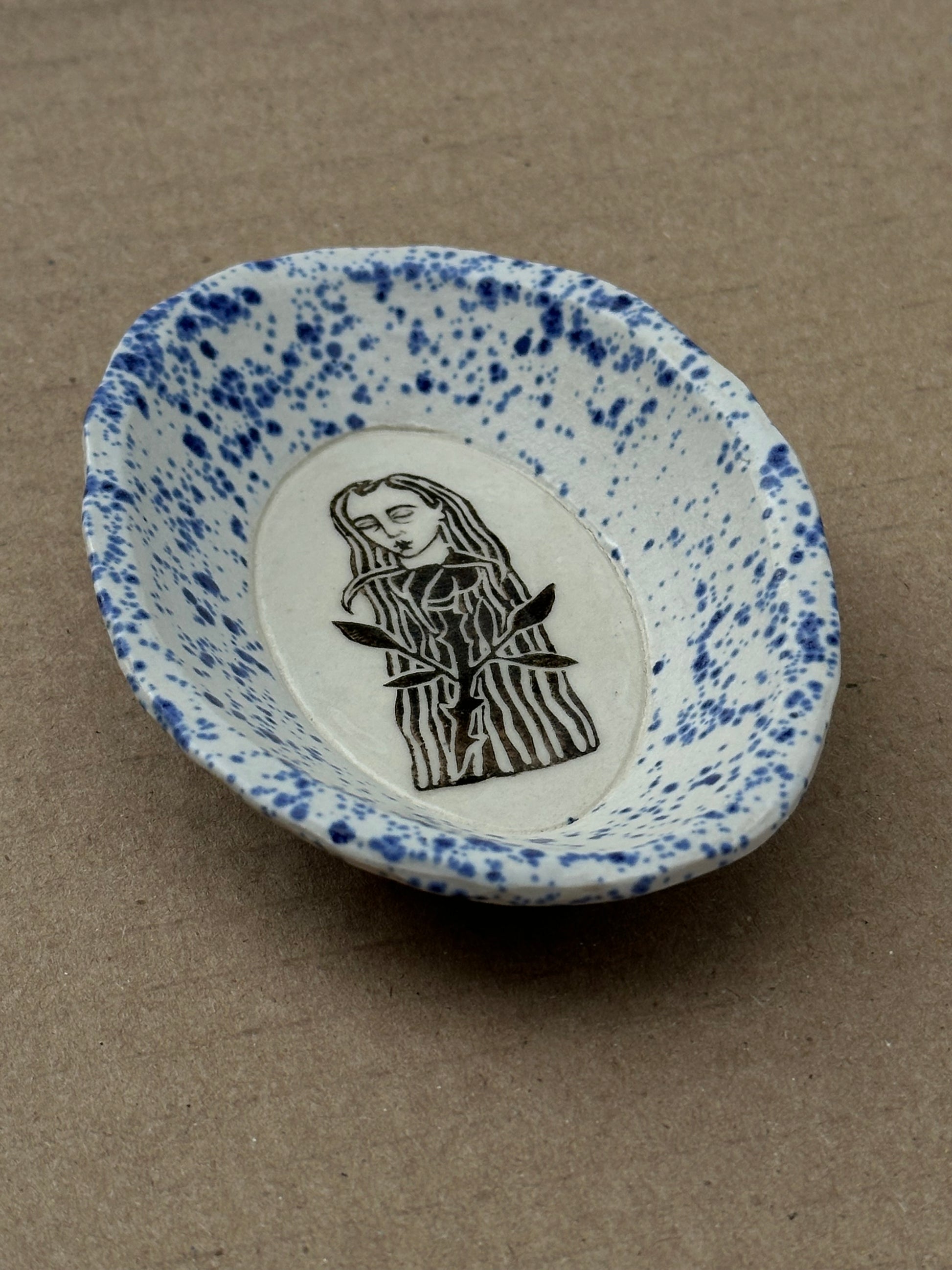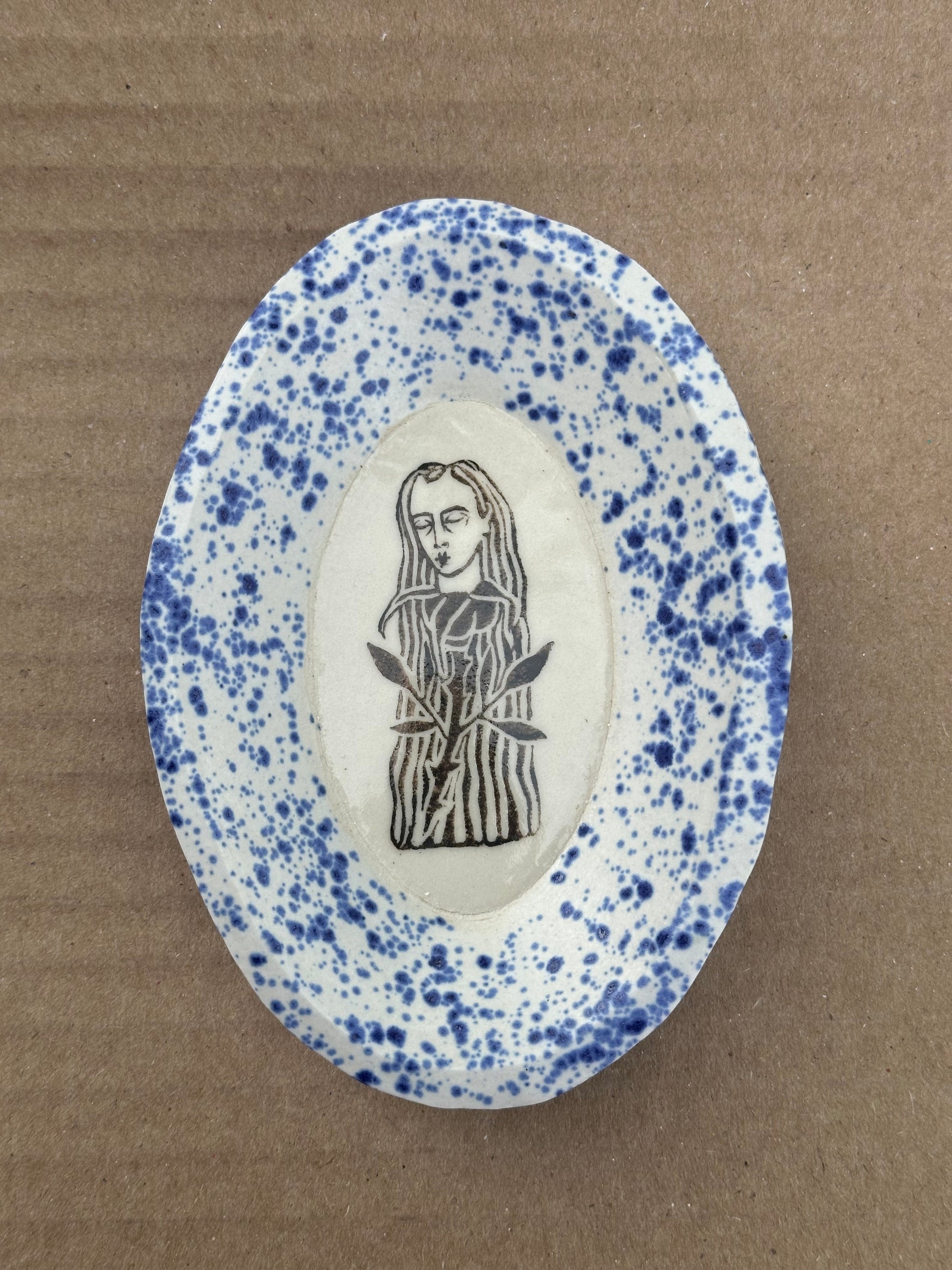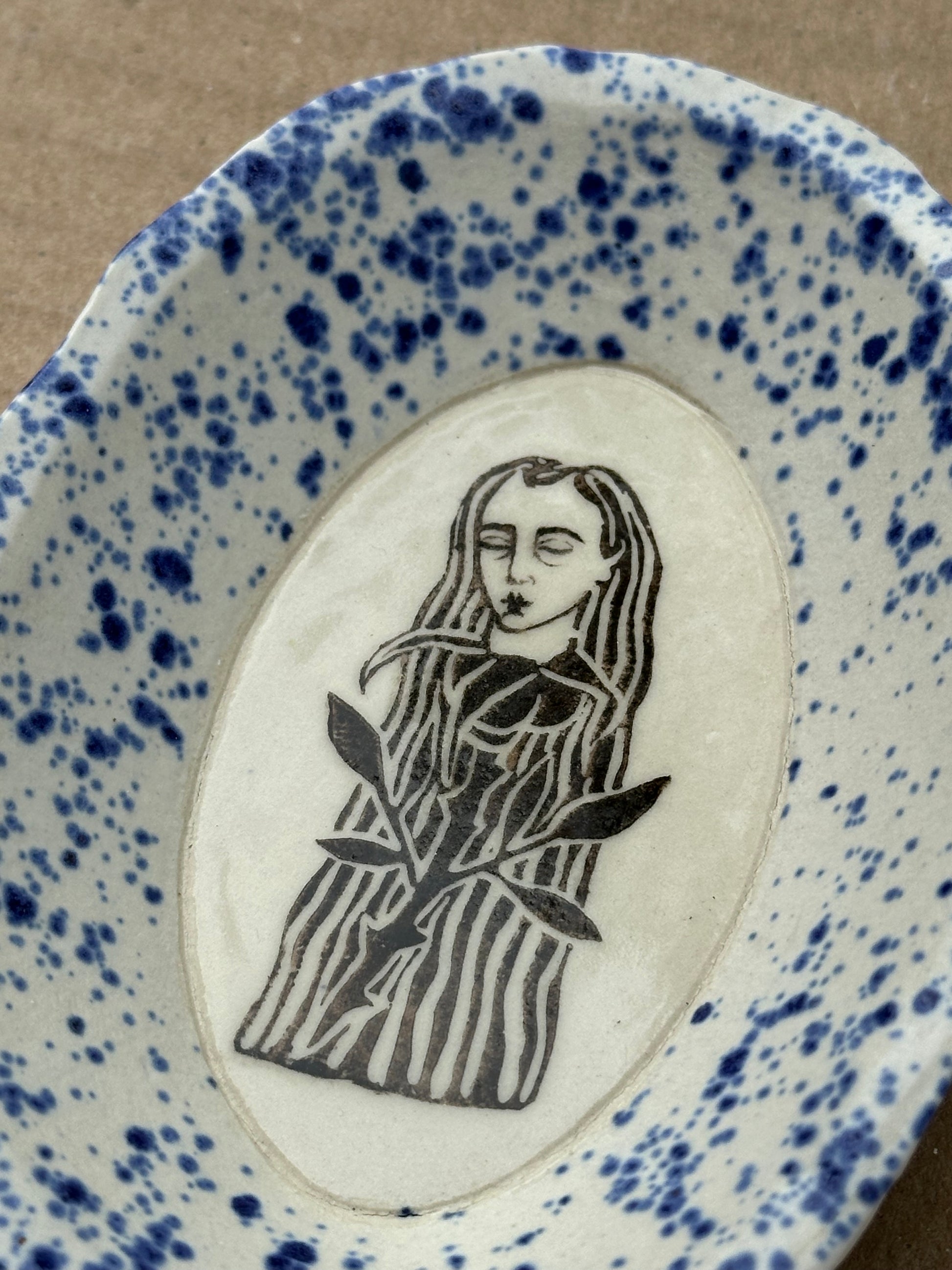Exterior of the dish is glazed with milky satin featuring small blue blooms that cause the glaze to resemble the look of 19th century enamelware.