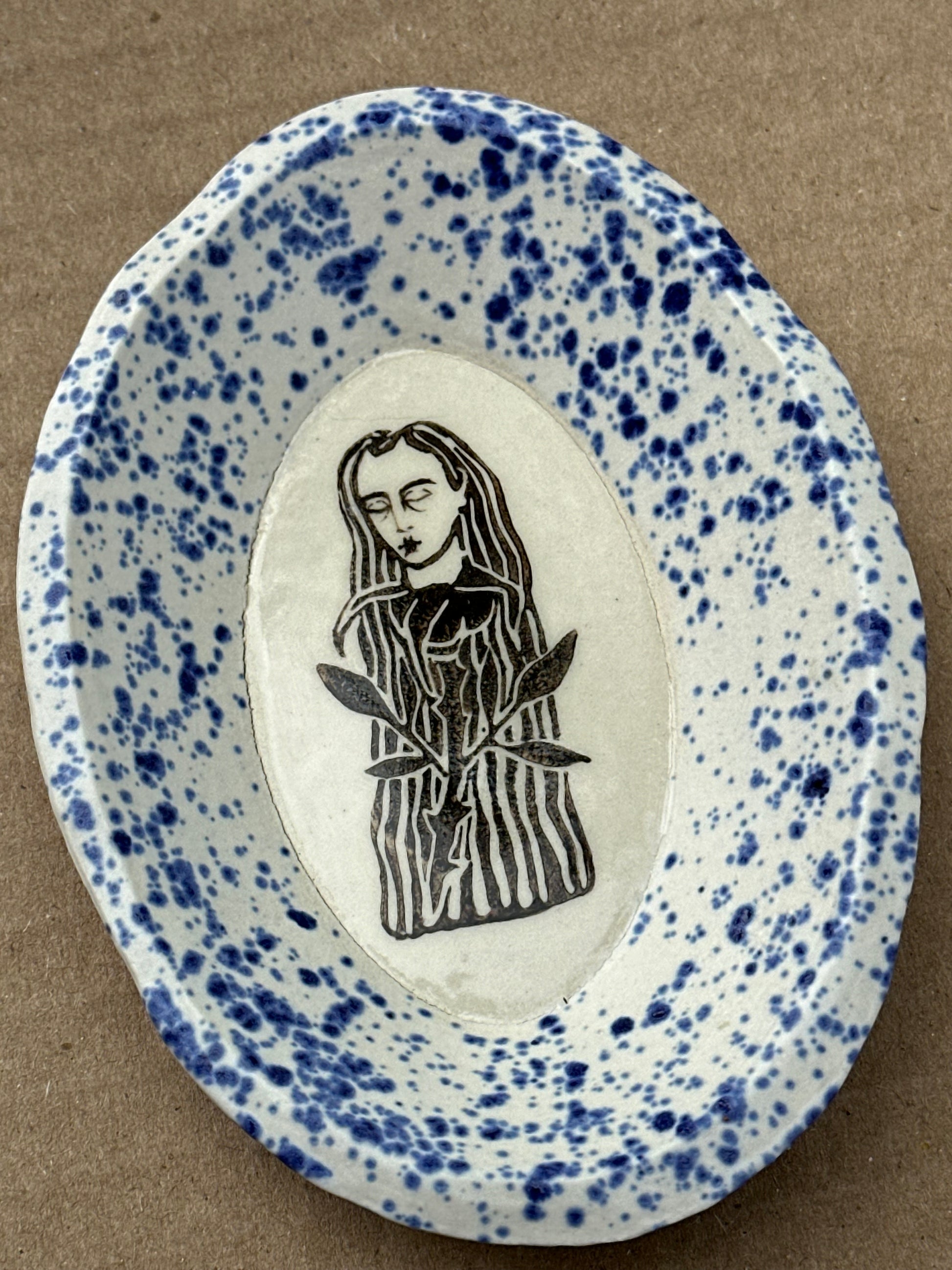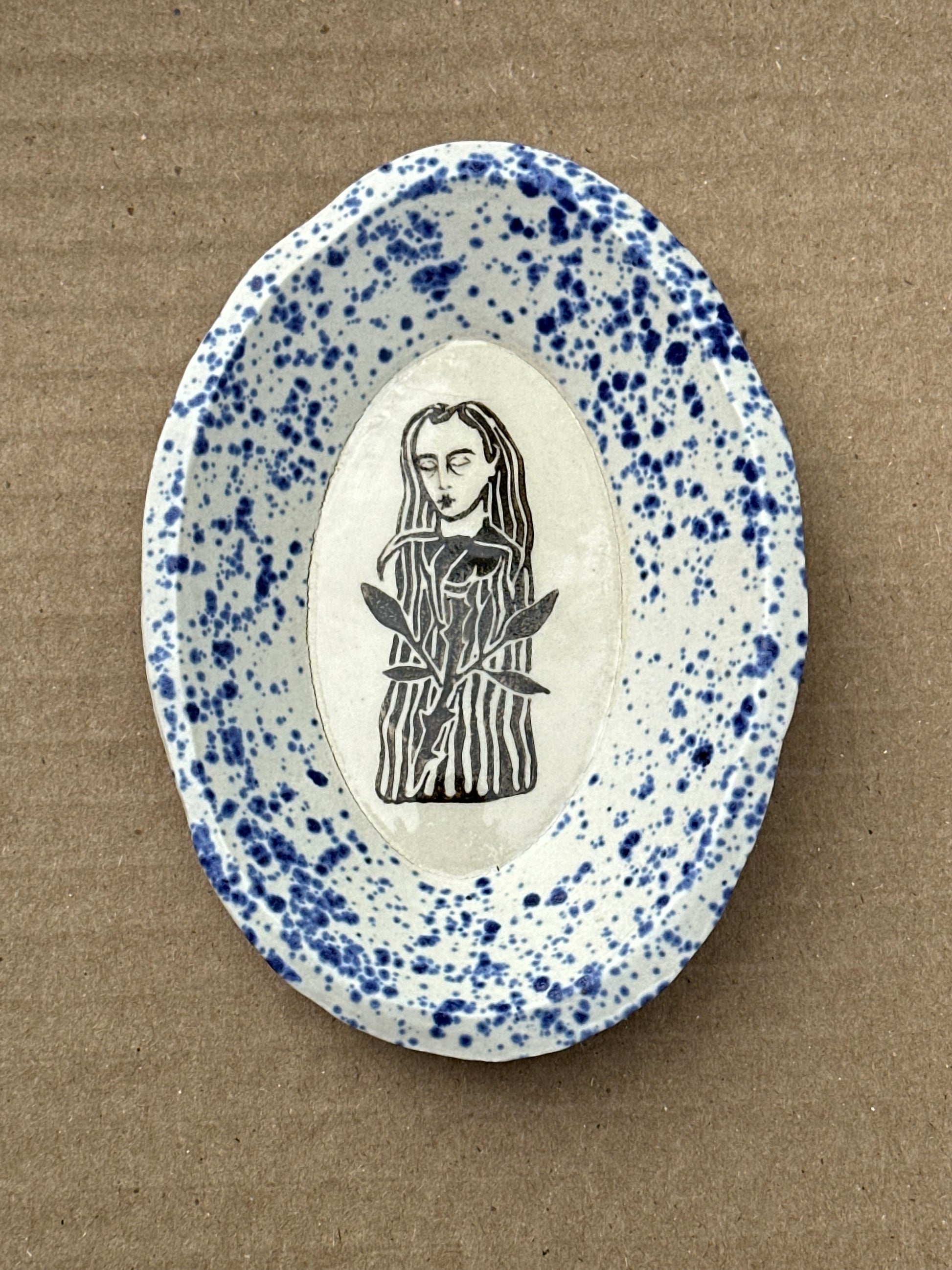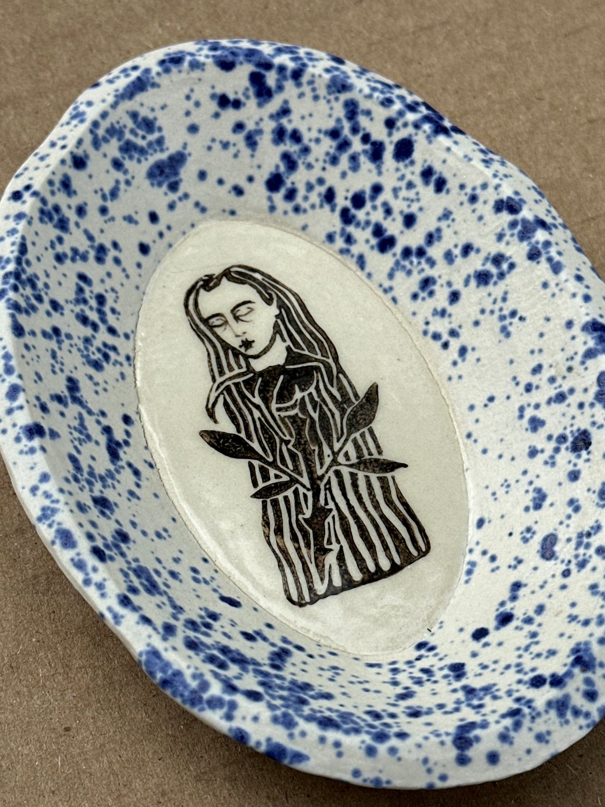 Exterior of the dish is glazed with milky satin featuring small blue blooms that cause the glaze to resemble the look of 19th century enamelware.