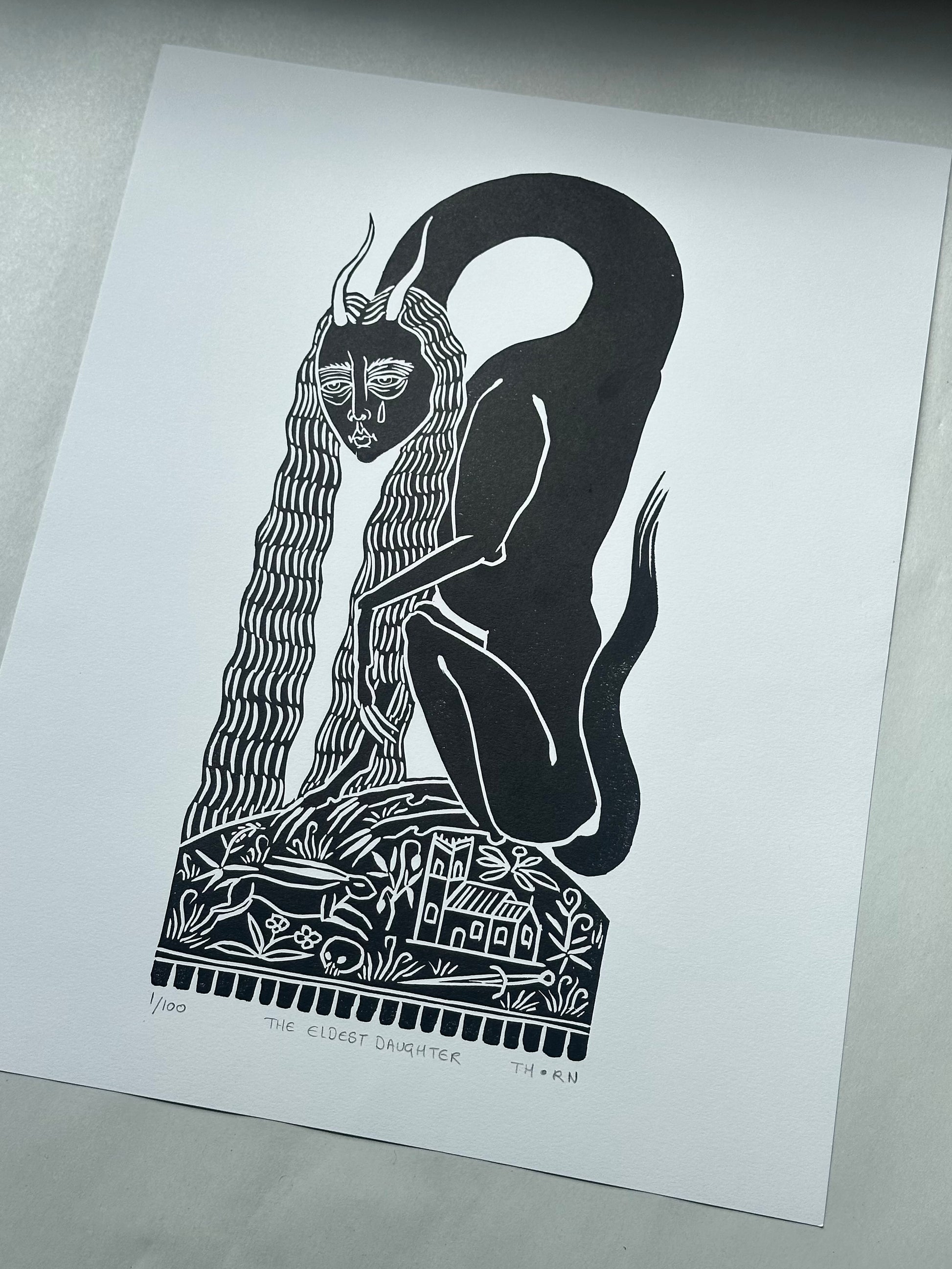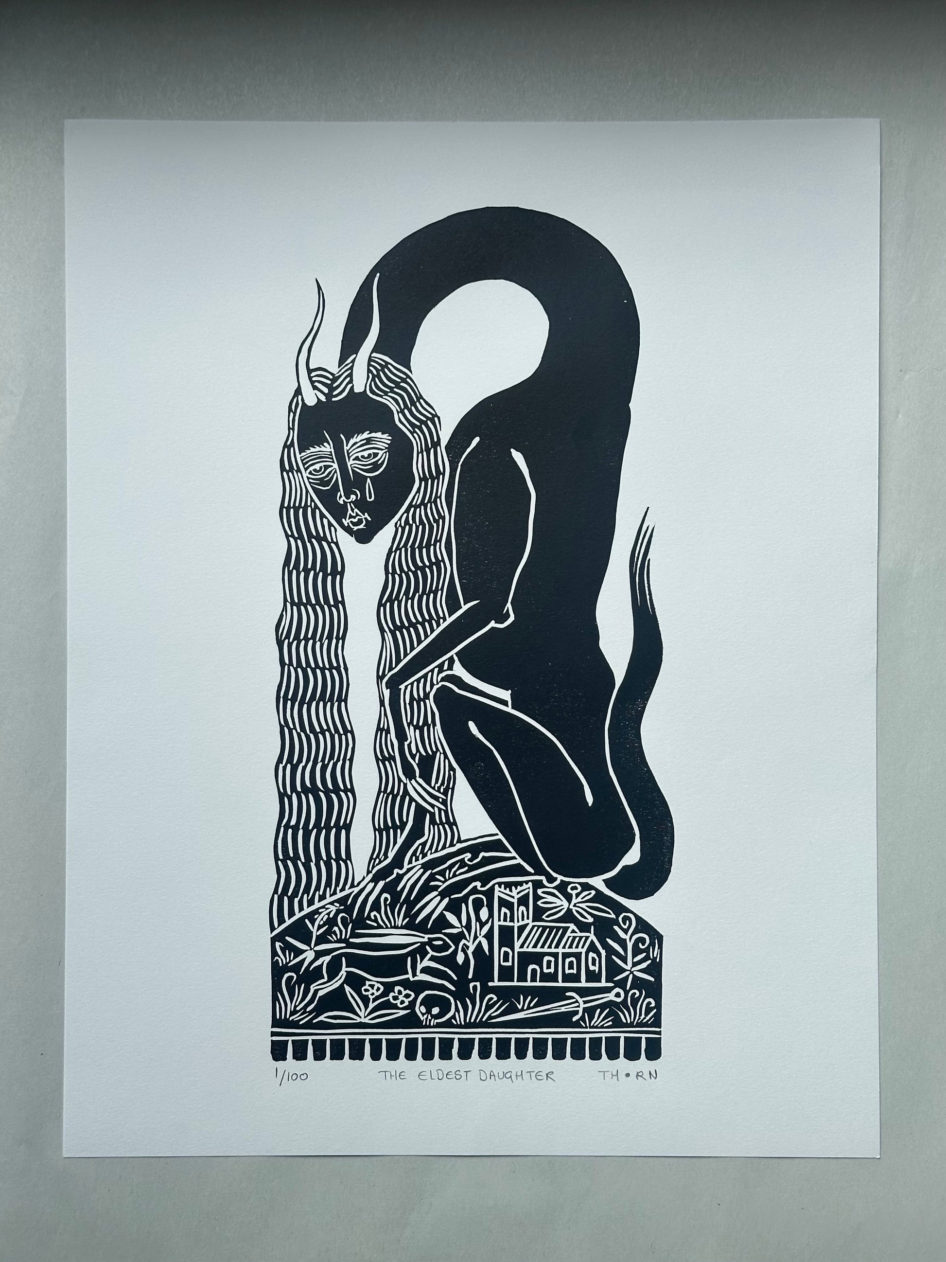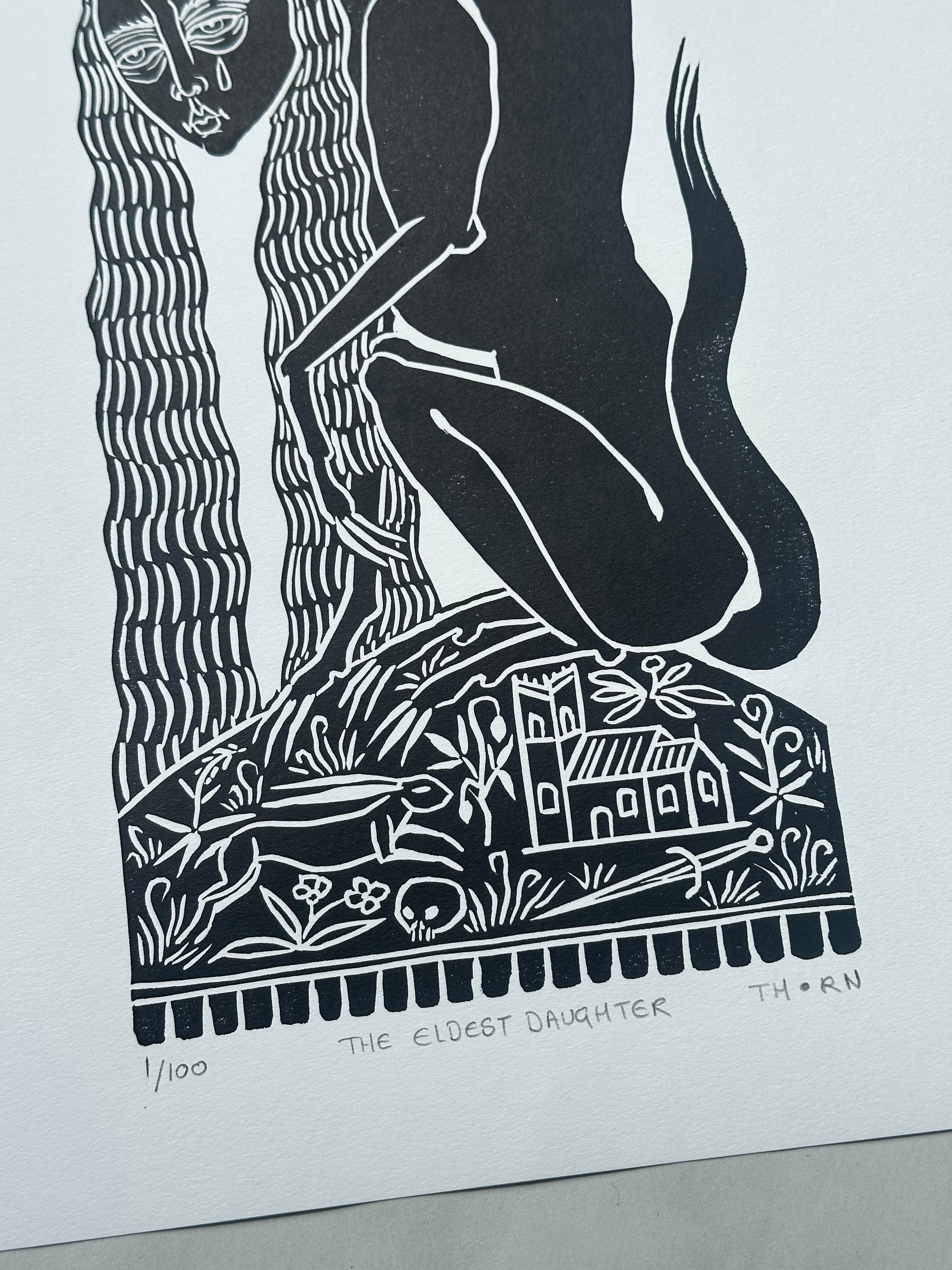 This limited edition handmade block print features a striking large black image of The Eldest Daughter, a powerful beast inspired by brass rubbings of medieval relief imagery. Each print is signed, titled, and numbered by the artist, emphasizing its uniqueness and collectible quality.