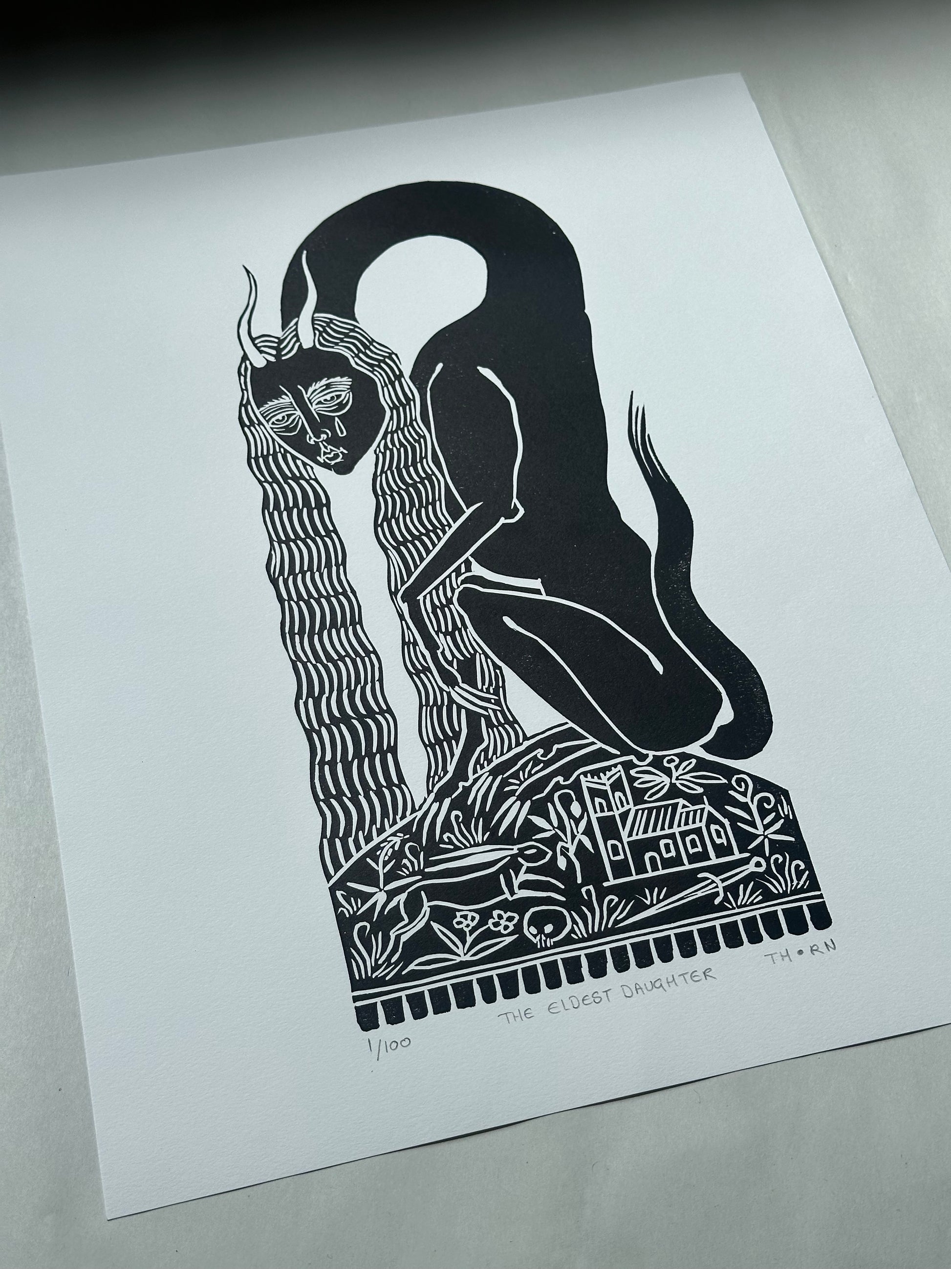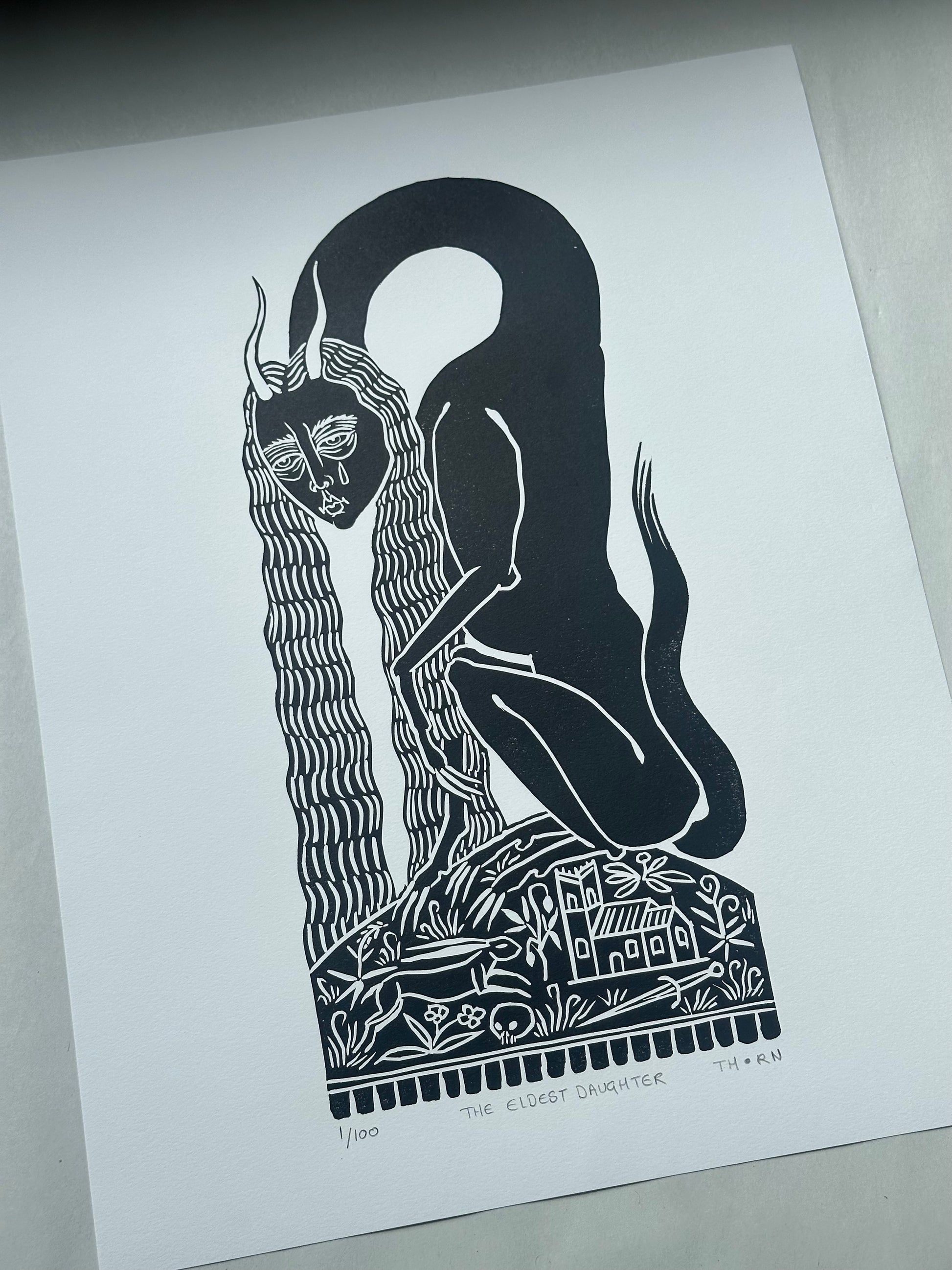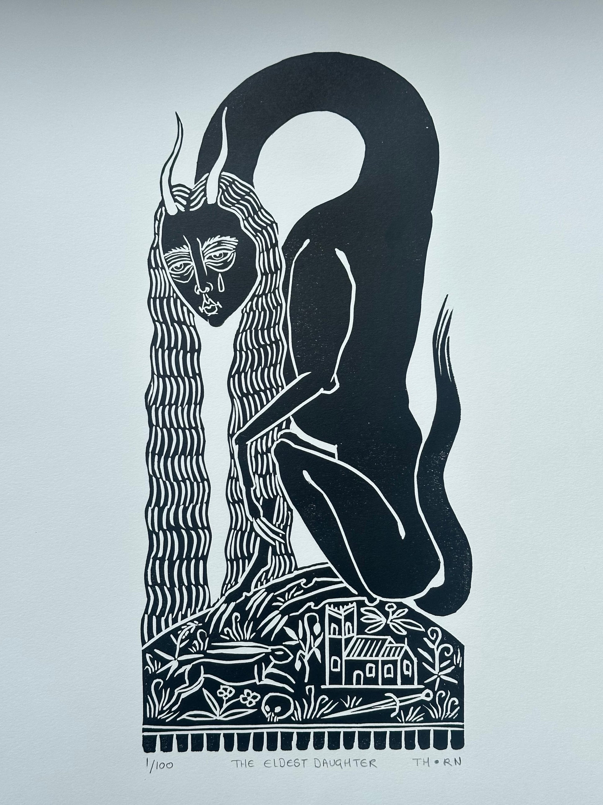 This limited edition handmade block print features a striking large black image of The Eldest Daughter, a powerful beast inspired by brass rubbings of medieval relief imagery. Each print is signed, titled, and numbered by the artist, emphasizing its uniqueness and collectible quality.